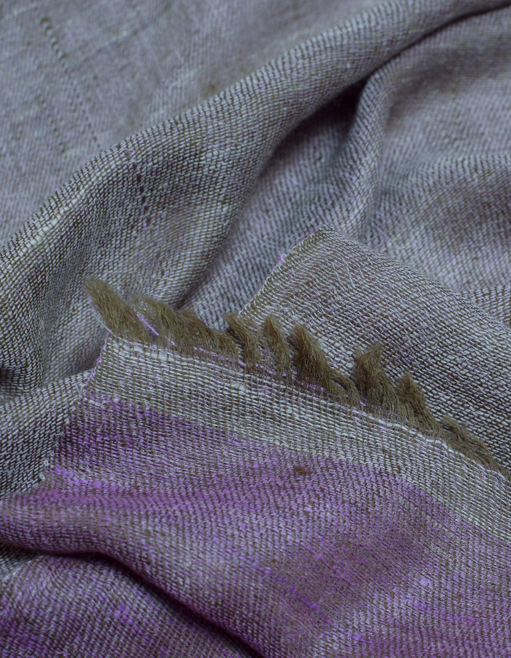 PRODUCT DESCRIPTION: A lavender colour extracted from the saffron flower grown in Kashmir. The soft gold pashmina is dyed in hues of red gold saffron flowers. One side offers a smooth, solid texture in lavender, while the other in pastel grey is perfect for those serene, fragrant moments of ancestry. Celebrate the authenticity and purity of our land, knowing that each piece carries the heartfelt dedication of the artisans who crafted it.