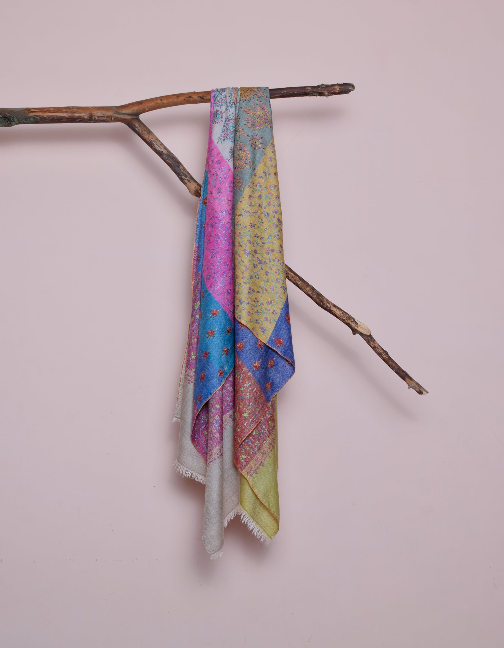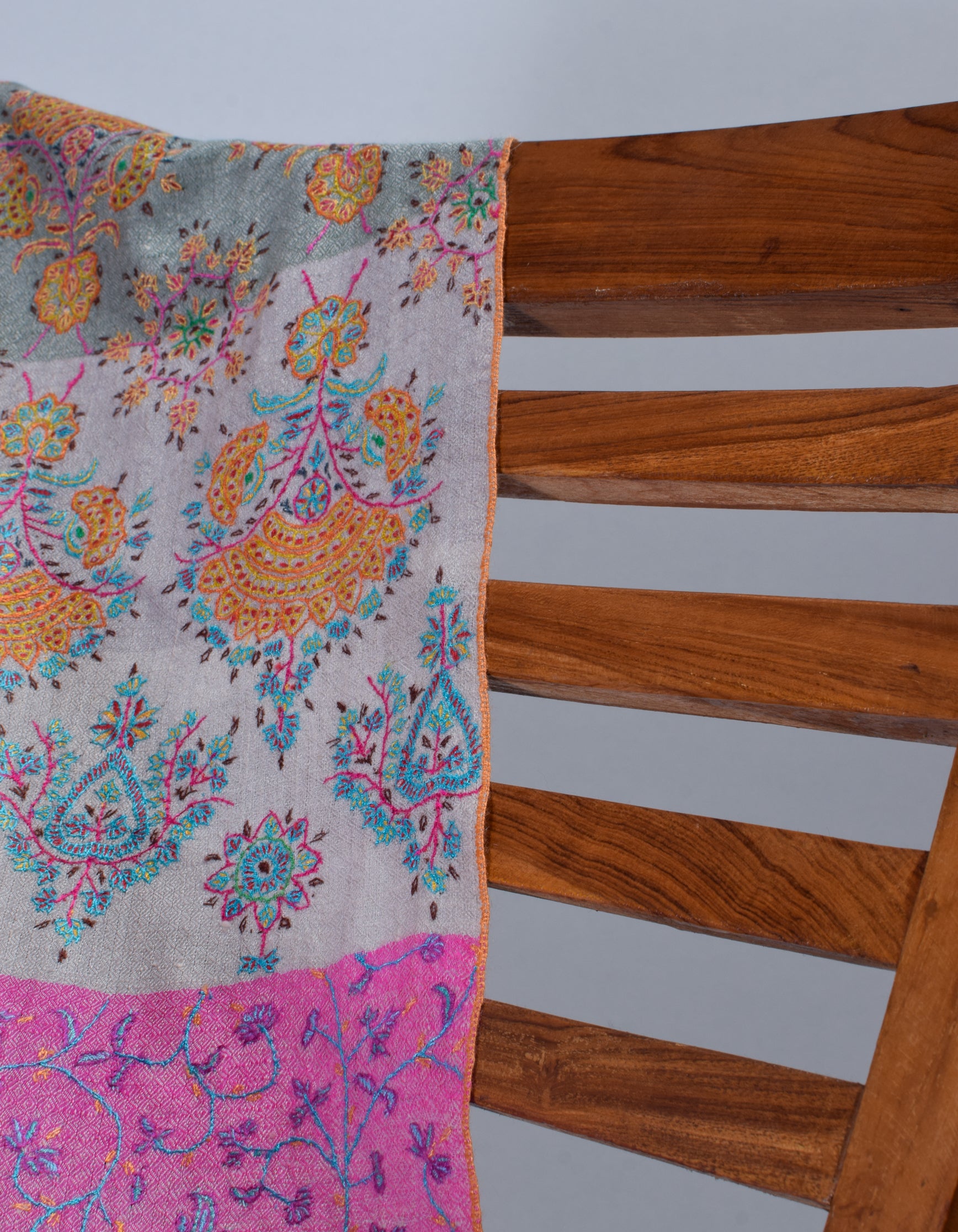 PRODUCT DESCRIPTION: Feel the connection to the hands that made this cashmere pashmina stole, featuring multicolour stripes adorned with a floral jaali, showcasing bouquets and bootis in various designs that repeat symmetrically. A beautiful, delicate border at the palla features floral embroidery that gracefully faces downward. Every inch of this cashmere stole carries the heritage of Kashmir. This stole is a labour of love, made with care and dedication. You deserve to wear something that tells a story—a story of tradition and artistry, something uniquely made for you.