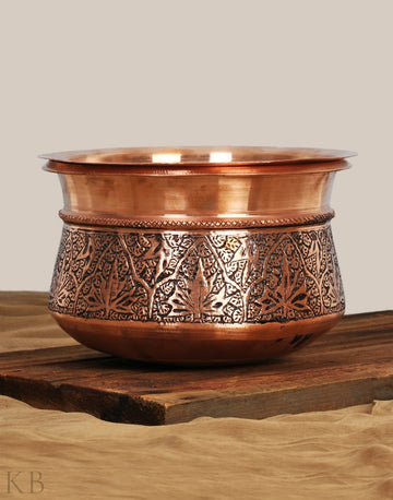 Locally known as Handi, it takes its design inspiration from the chinar vines coupled with the royale demeanor of Copper, traditionally called the Kandkaerr design. Along with the hand-engraved designs, it is outlined with black borders to give the classic designs a more definite and vivid look. The classic piece of serveware flaunts a hand engraving which the artisan chisels out through its very essence. The Handi comes with a beautiful lid. Enriching whatever it stores with its minerals, add a vessel of wellness to your kitchen cabinet.