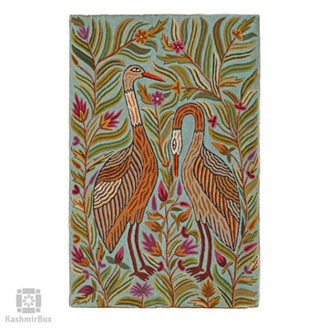 DESIGN DESCRIPTION : A Kashmiri craft inspired by tropical bird illustrations with a touch of folk or naive art. The design features two long-necked birds, likely herons, surrounded by tropical plants. The pattern covers the entire space, creating a naturalistic feel, with the birds slightly off-centre for a more natural look.