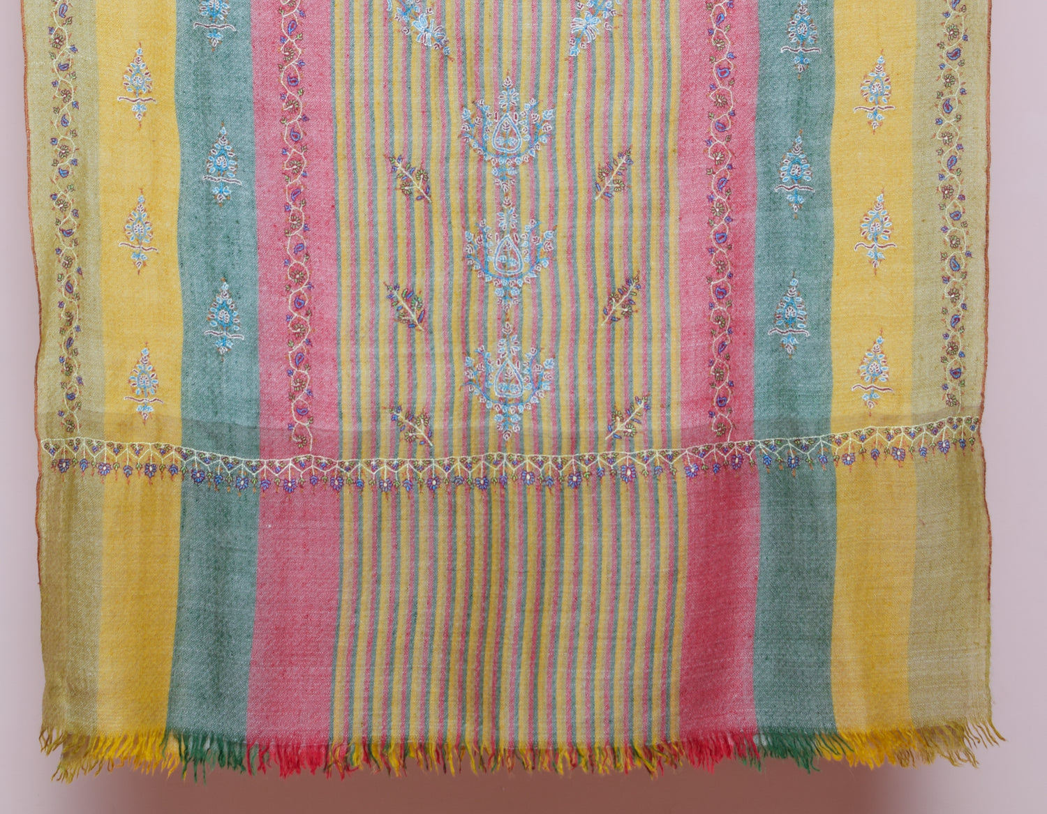 PRODUCT DESCRIPTION: Feel the heartfelt craftsmanship in every inch of this modern cashmere pashmina stole, woven in lively colours with fine lines and stripes. The hand embroidery, predominantly highlighted in turquoise blue thread, adds a graceful touch. This stole embodies the spirit and heritage of Kashmir, where artisans dedicate countless hours to weaving each thread, drawing on generations of skill. It’s a true labour of love, crafted with care and dedication—an heirloom that speaks to your heart and connects you to a tradition that transcends time.
