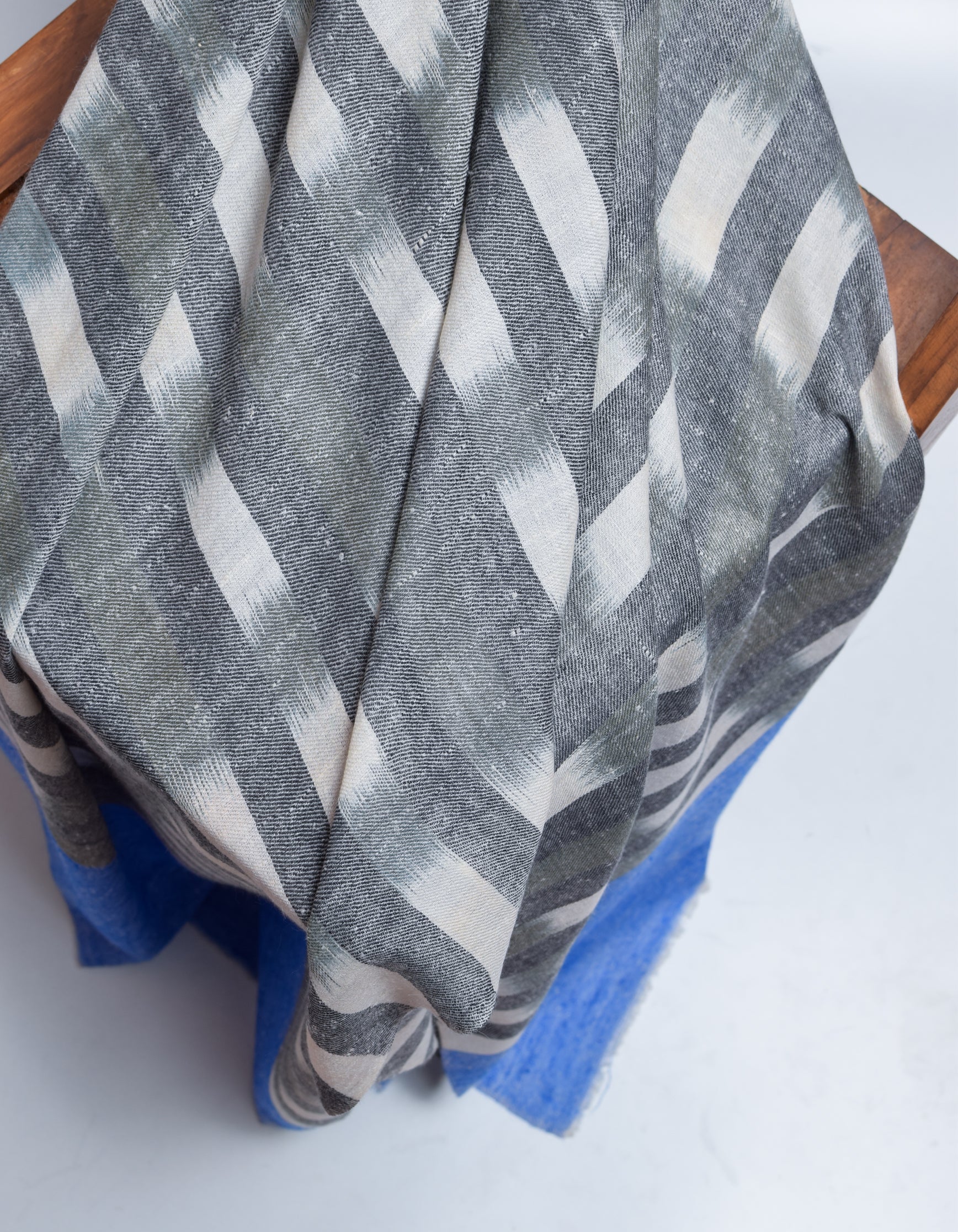 PRODUCT DESCRIPTION: Handwoven by skilled Kashmiri artisans on traditional looms, this craft is a blend of history and artisans' dedication, echoing the region's textile heritage. This pashmina stole displays elegant black and cream stripes, complemented by dark olive grey ikat patterns woven in between. The royal blue side palla gracefully flows downward, adding a touch that heightens its overall sophistication. Celebrate the warmth and beauty of Kashmir with a piece that feels as wonderful as it looks.