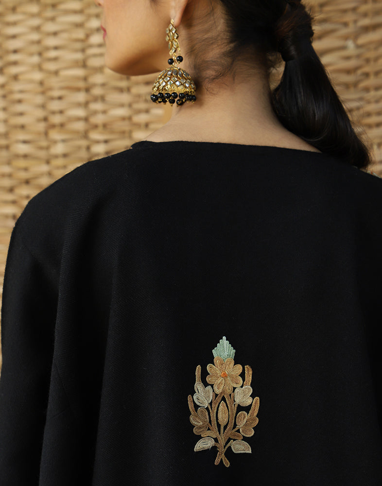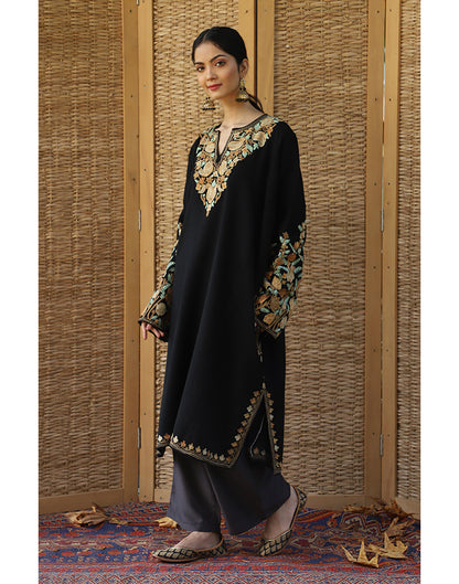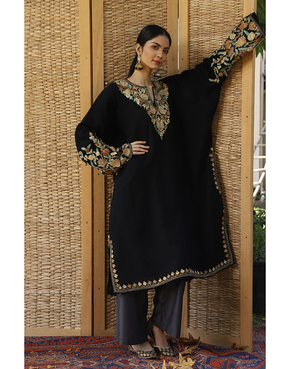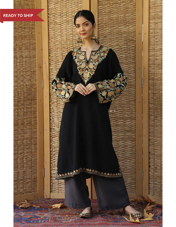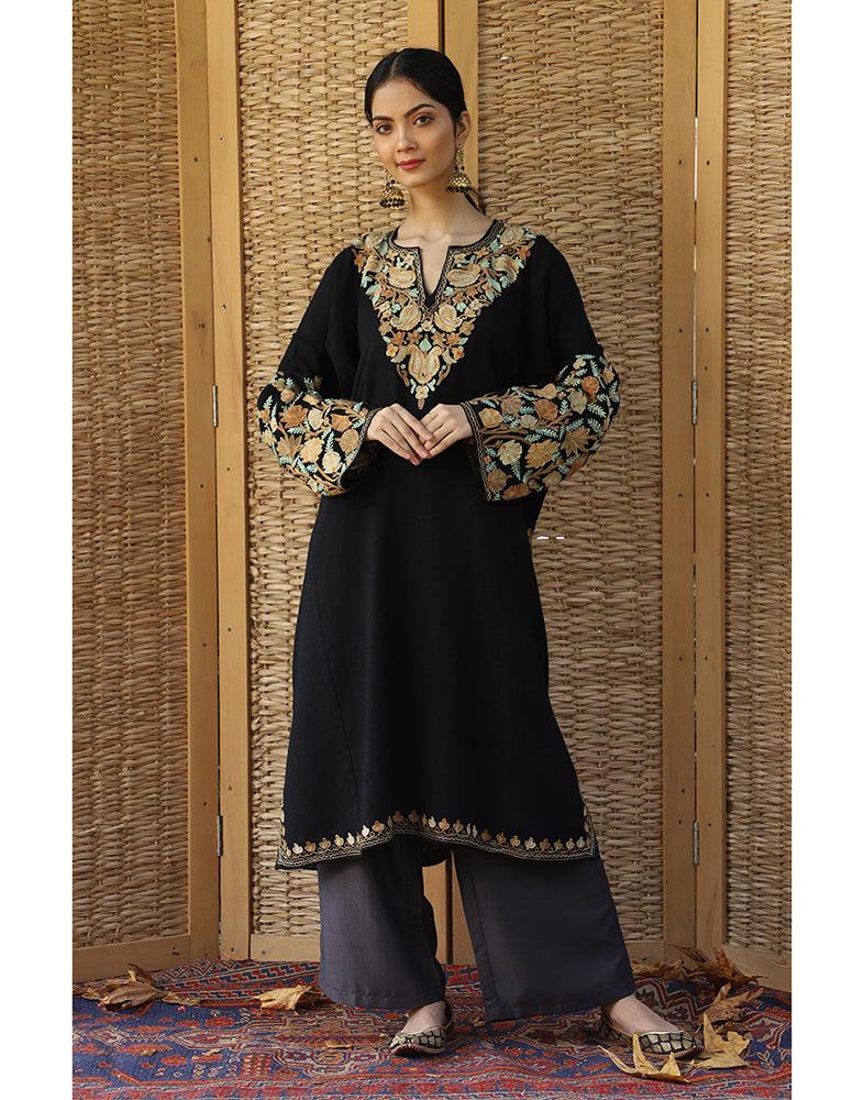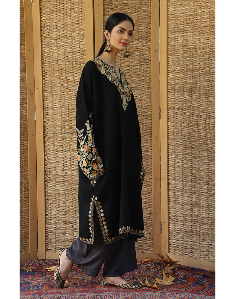 PRODUCT DESCRIPTION: Far beyond ordinary clothing, this phiran offers a glimpse into Kashmiri textile tradition. The sophisticated black wool fabric serves as a dramatic backdrop for the exquisite Aari embroidery. The traditional paisley motif is beautifully embroidered, with the sleeves and neckline being standout features. This design creates a mesmerising appeal, reminiscent of a lush, exotic garden blooming around the wearer.