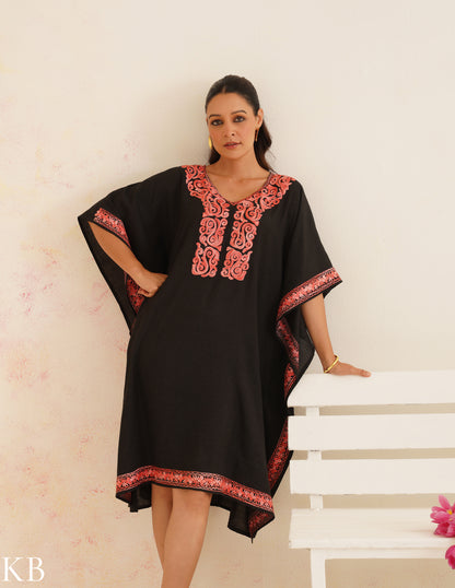 Black Cotton Kaftan Dress with Coral Embroidery | Comfortable Loose-Fit | Elegant Summer Ethnic Wear