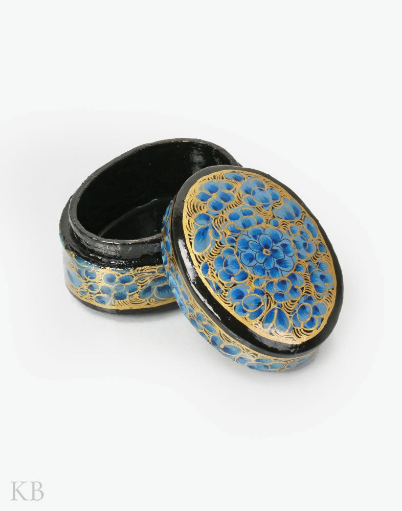 As the all-encompassing scenic beauties of the paradise Kashmir surrounds the artist, he decides to choose the pretty little spring flowers as the primary inspiration to paint over his masterpiece, a wedding ring box, to make your special day more special. Designed in the deft paper mache, the box is crafted in the black shade over which small bright florets, painted in a dazzling blue shade create a fascinating finishing touch. A perfect pick for those ready to start a new life, the box will create magic as you present it to the one to whom your heart is connected forever.