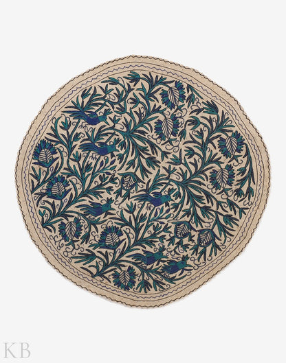 DESIGN DESCRIPTION: Artisan-crafted namda in shades of blue and turquoise beautifully showcases intricate floral motifs, leaves, vines, and birds. The design captures a serene morning scene, where birds chirp joyfully at dawn, symbolising hope and new beginnings. The edge is framed with a grey zigzag pattern and several thin concentric borders, highlighting the central design.