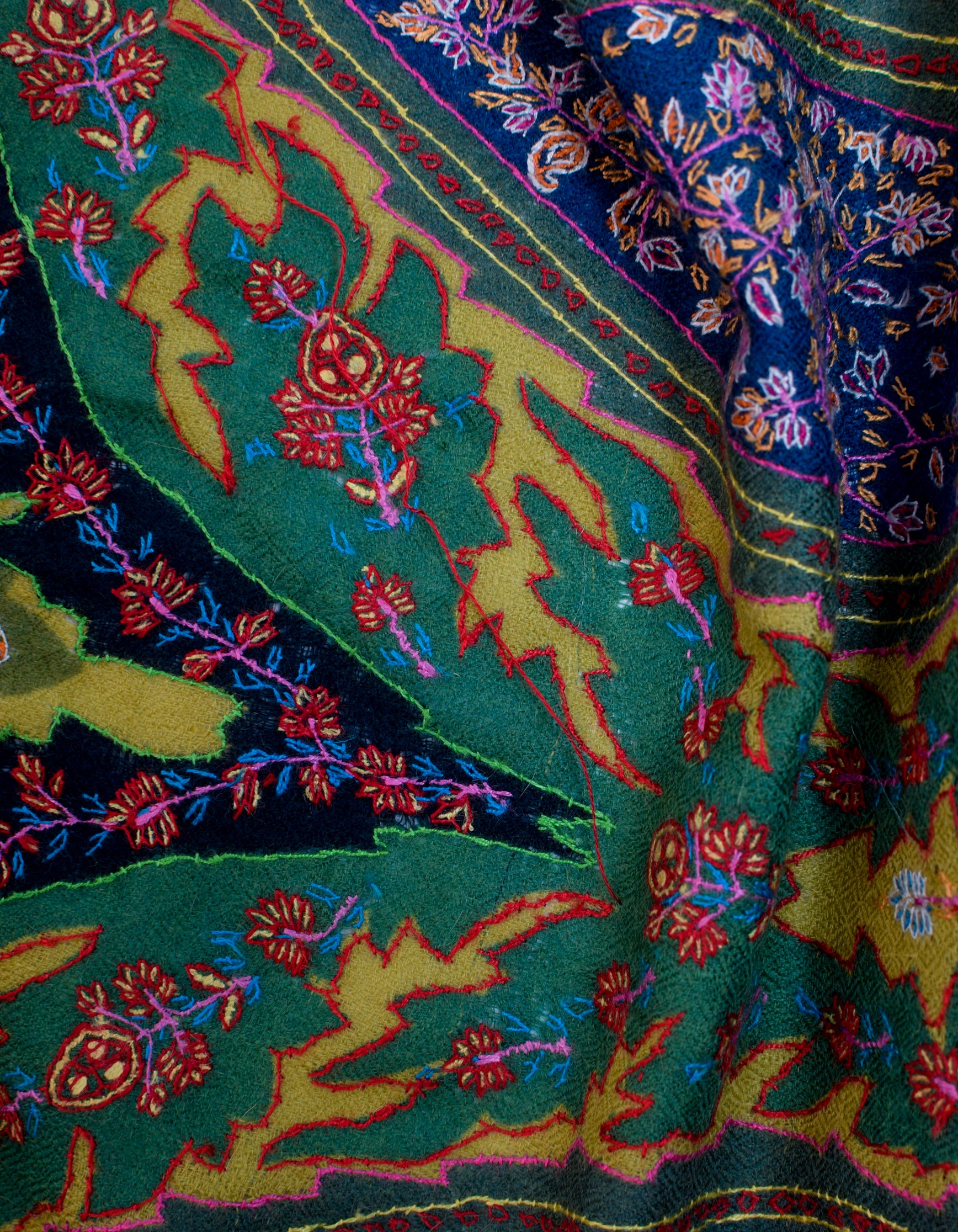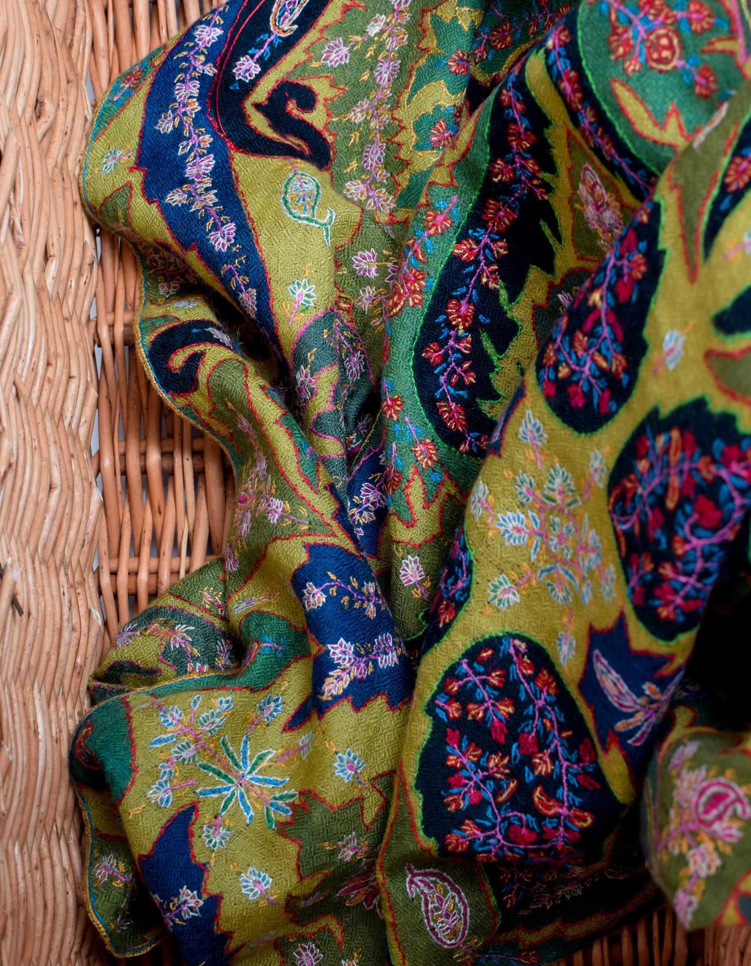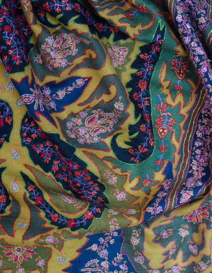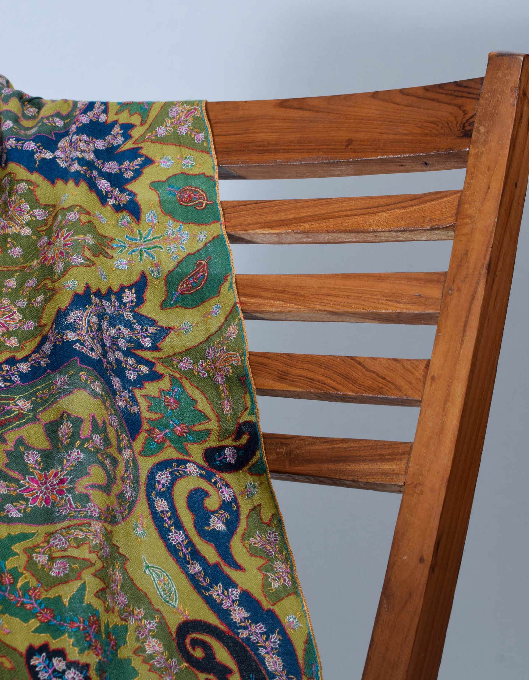 CRAFT FORM : Woven on a handloom and adorned with fine GI-Certified sozni needle embroidery, crafted using traditional Kashmiri techniques. COLOUR: Light olive green base with multicolour kalamkari kani prints and sozni embroidery.