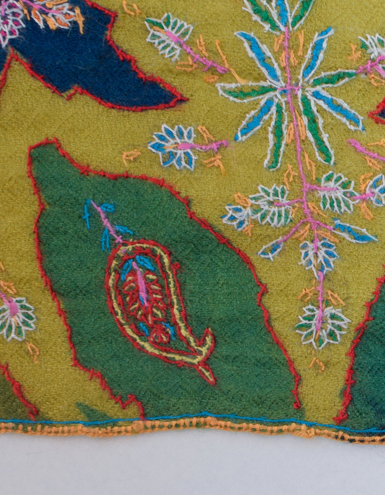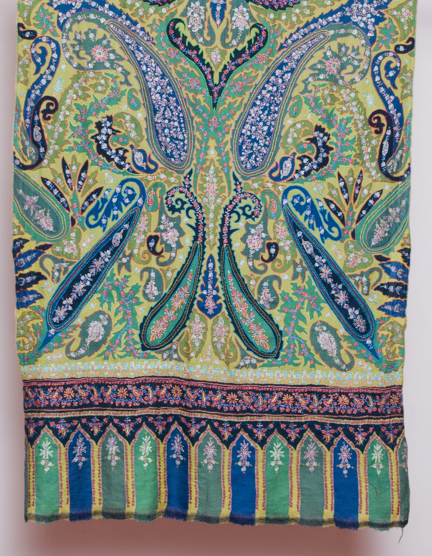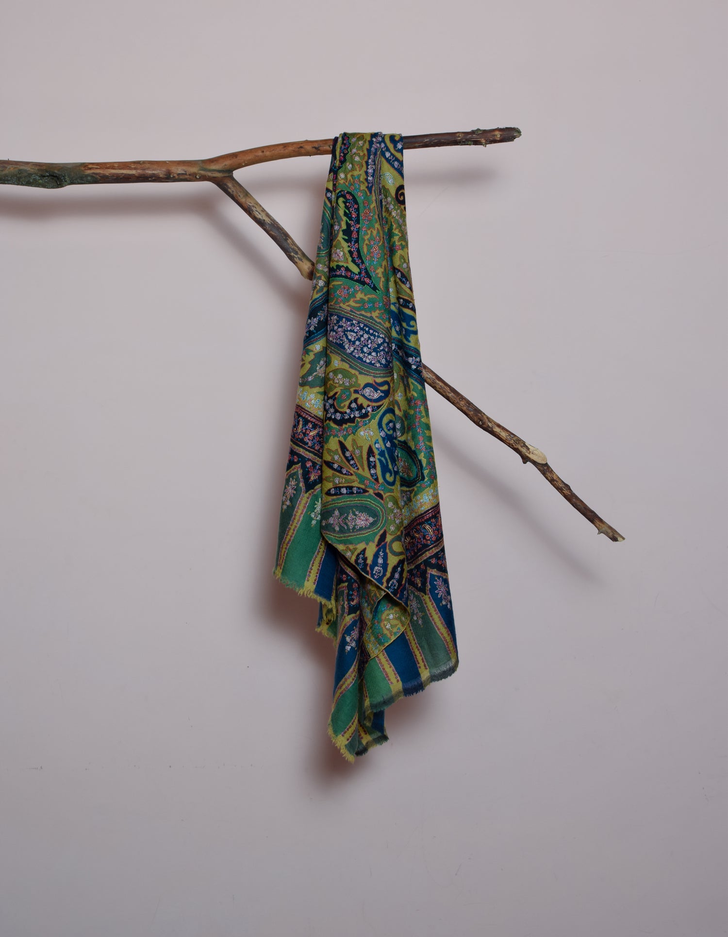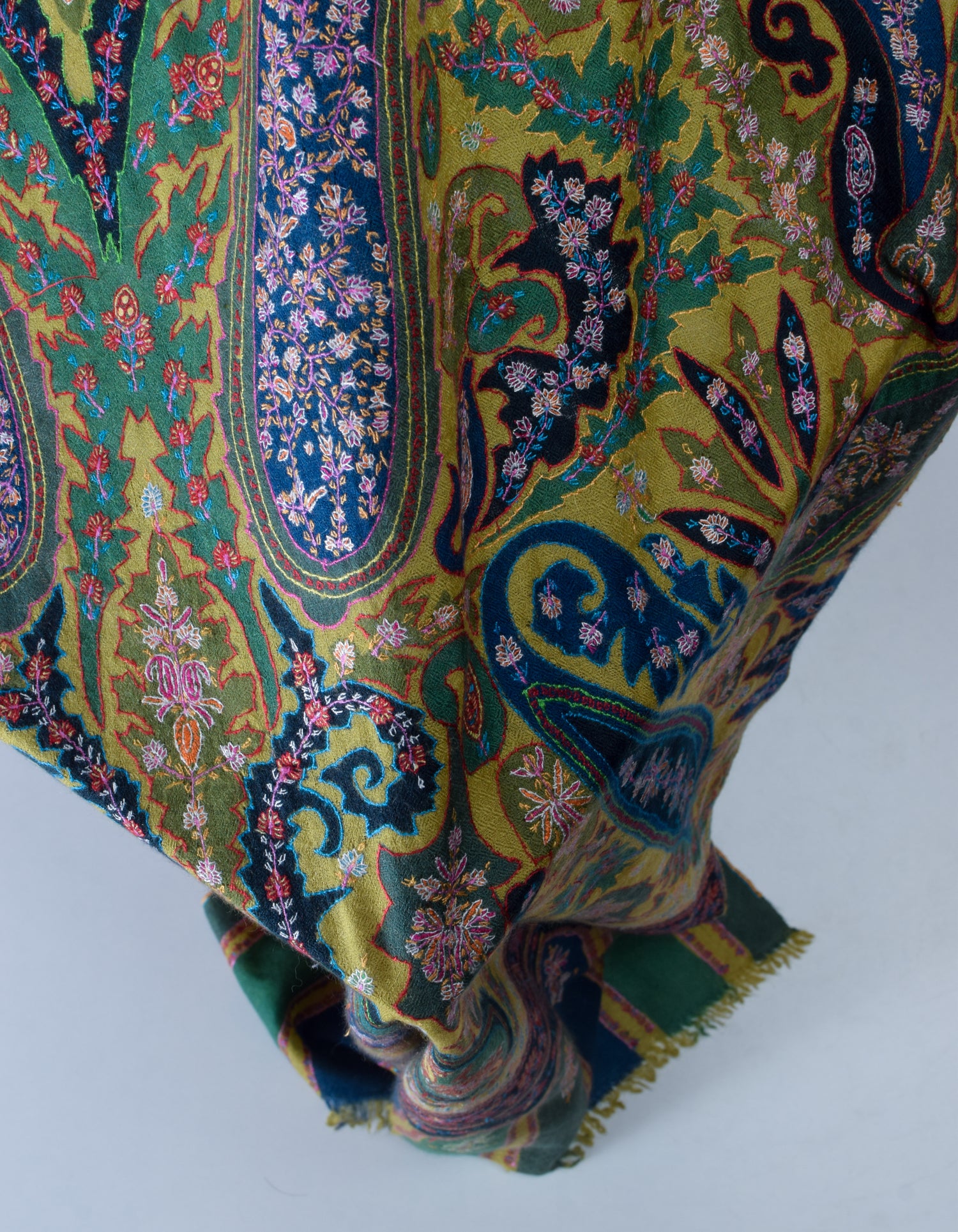 CRAFT FORM : Woven on a handloom and adorned with fine GI-Certified sozni needle embroidery, crafted using traditional Kashmiri techniques. COLOUR: Light olive green base with multicolour kalamkari kani prints and sozni embroidery.
