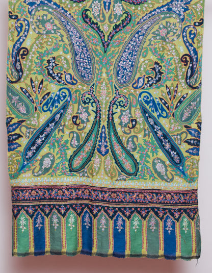 PRODUCT DESCRIPTION: The unmatched luxury of Kashmir is truly one of a kind. Our Pashmina Stole is carefully handwoven and adorned with intricate GI-certified sozni embroidery. Set against a soft light olive green base, it features multicolour kalamkari kani prints with bold paisleys, complemented by floral and paisley sozni embroidery. The palla is beautifully detailed with dual borders and arched stripes at the ends. This shawl exemplifies true sophistication, perfectly merging tradition with artistry.