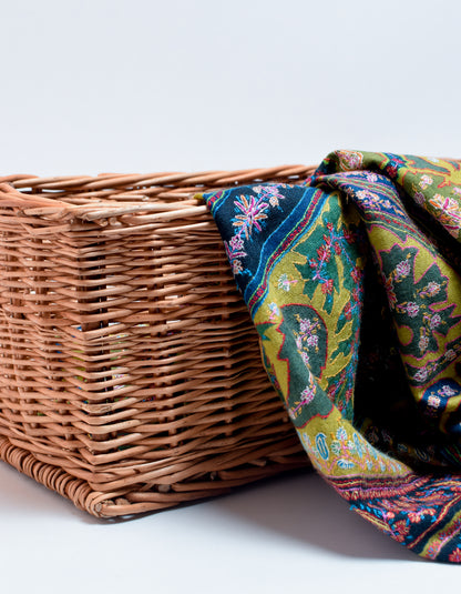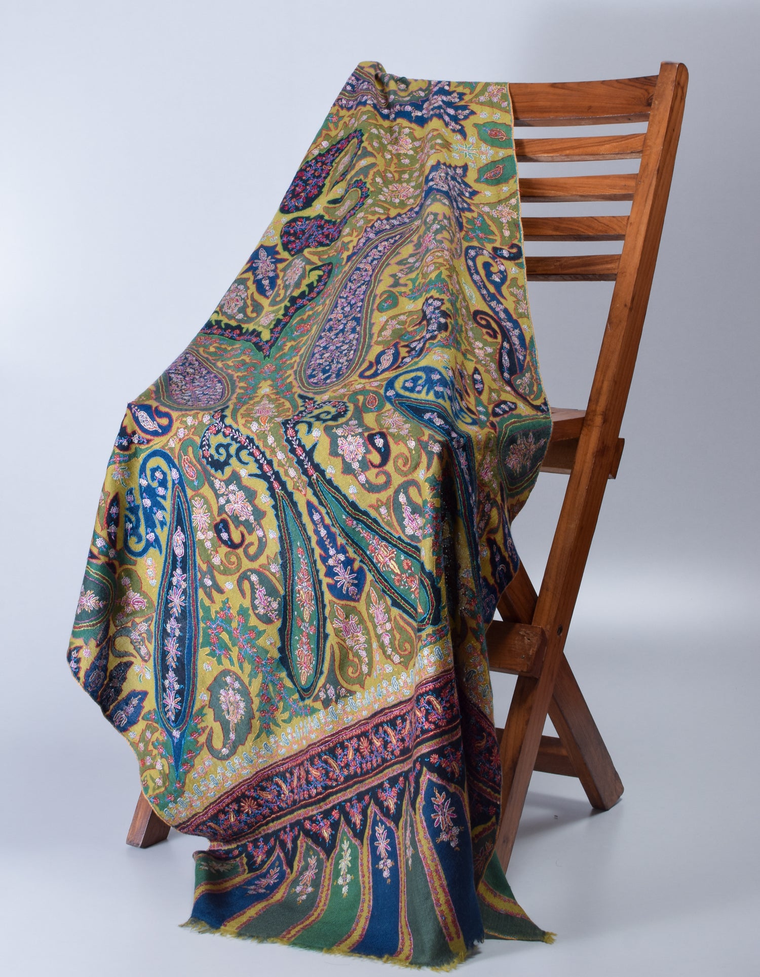 Light Olive Handmade Jamawar Sozni Certified Cashmere Pashmina Stole
