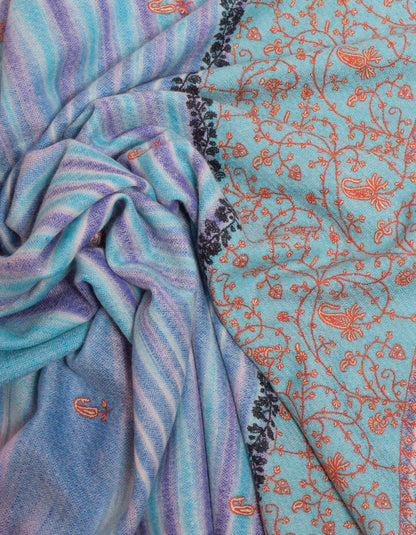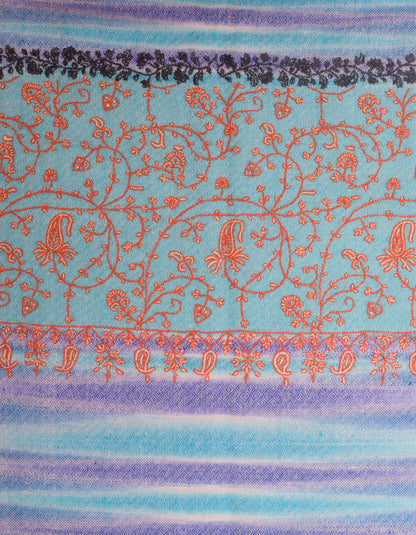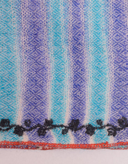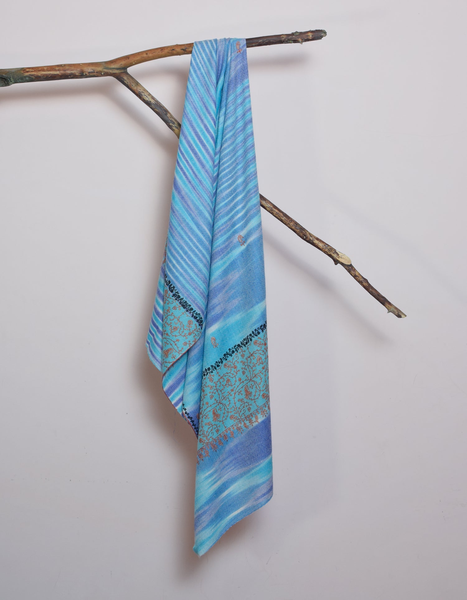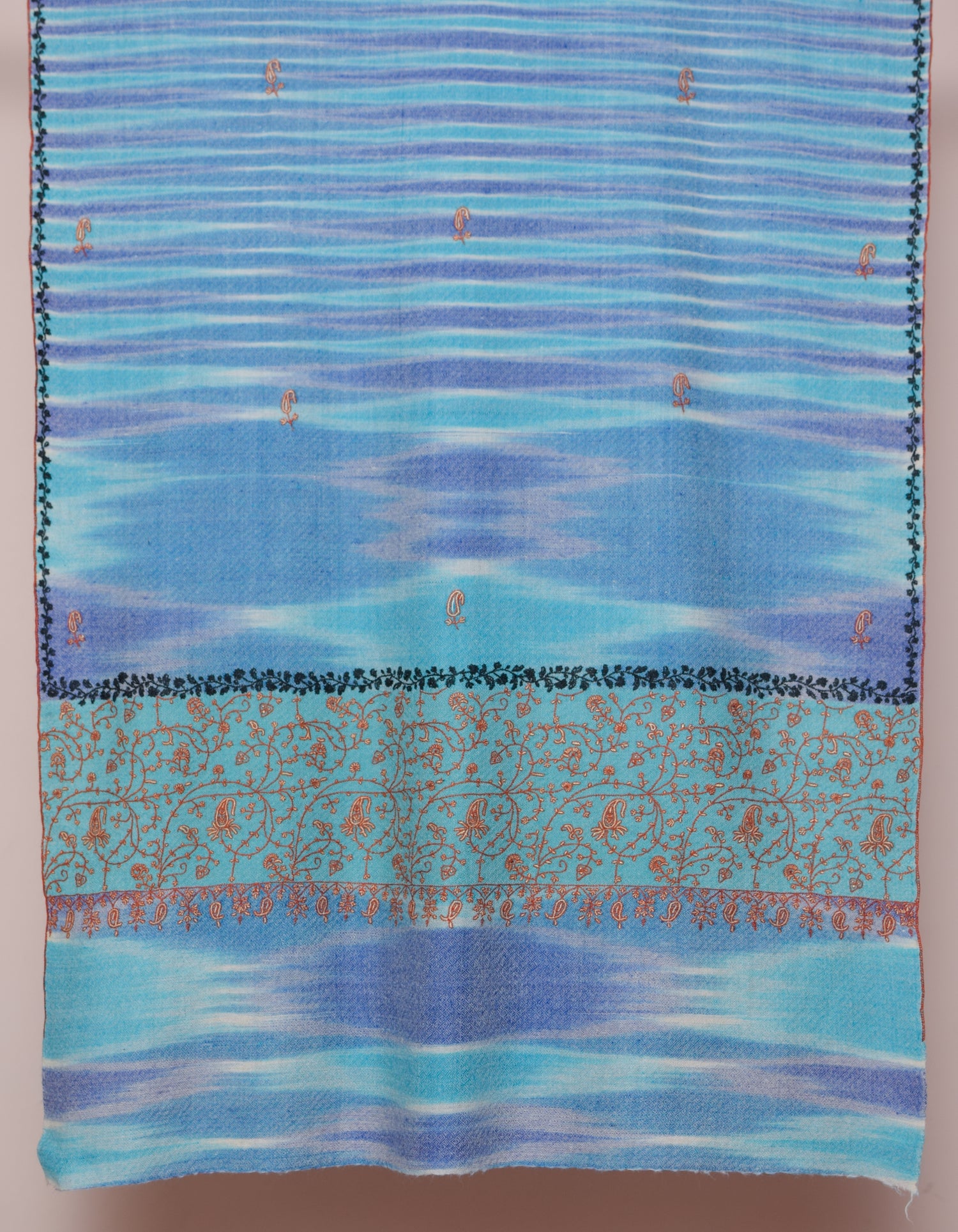 Multi-Blue Ikat Handwoven Sozni Embroidered Cashmere Pashmina Stole