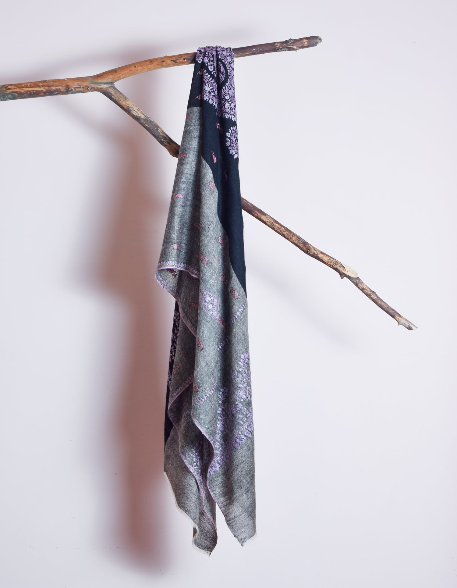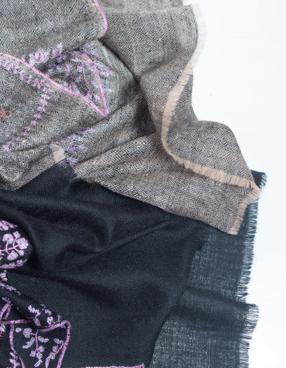 COLOUR: A dual-design, multicolour embroidered pashmina featuring one side in solid black and the other in a natural pashmina cream colour blended with black.