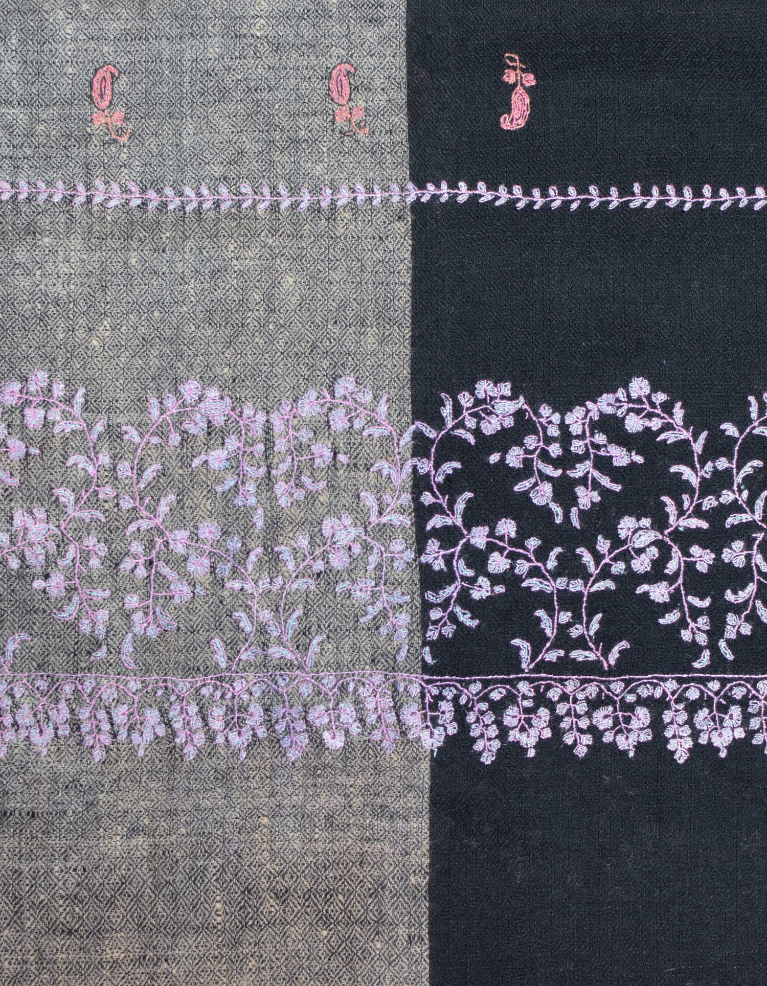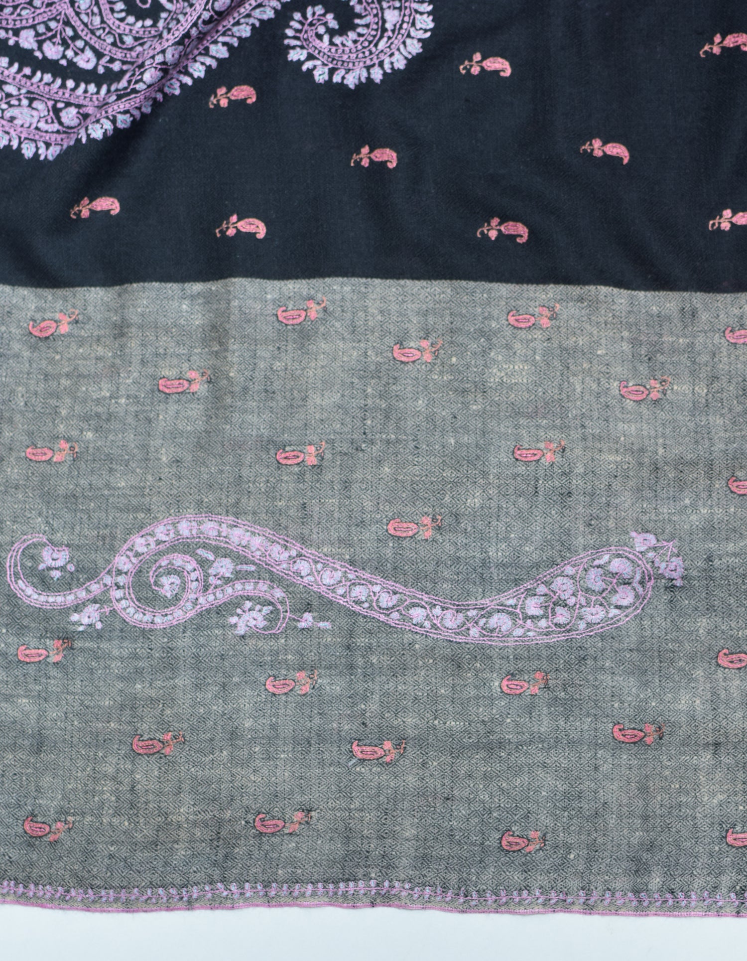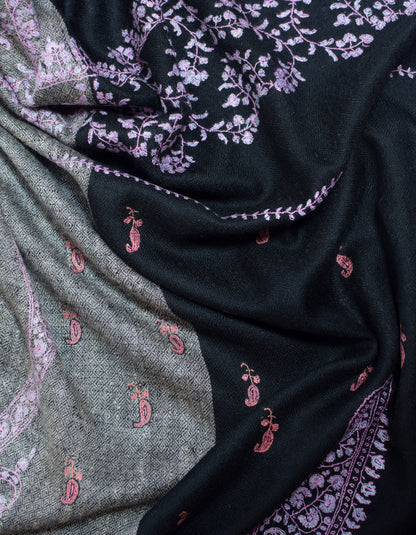 This pashmina stole features a dual design: one side in complete black and the other in a natural pashmina colour blended with black. The design showcases elongated paisley motifs and small paisley bootis surrounding it, complemented by a thin border. The palla is adorned with a broad floral border, adding a refined touch.