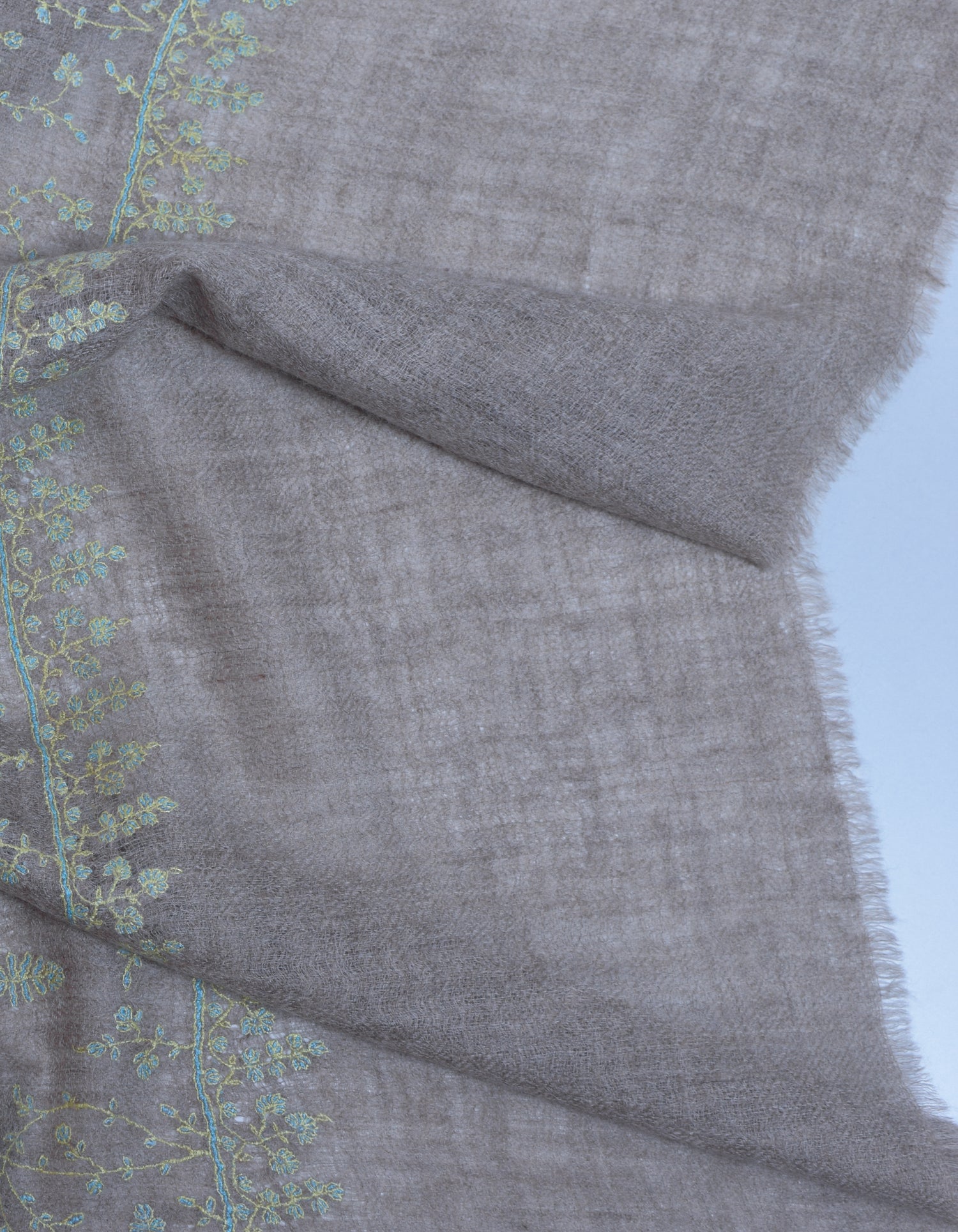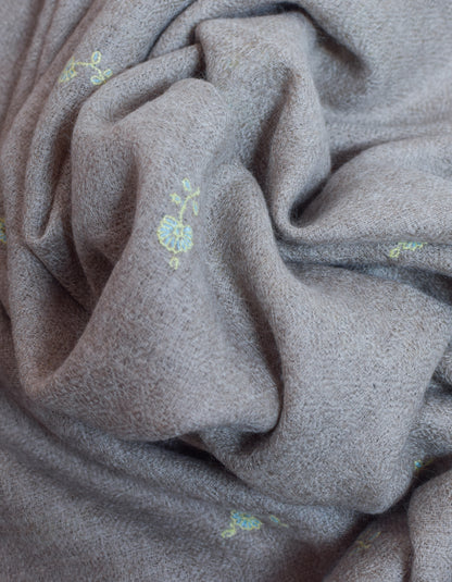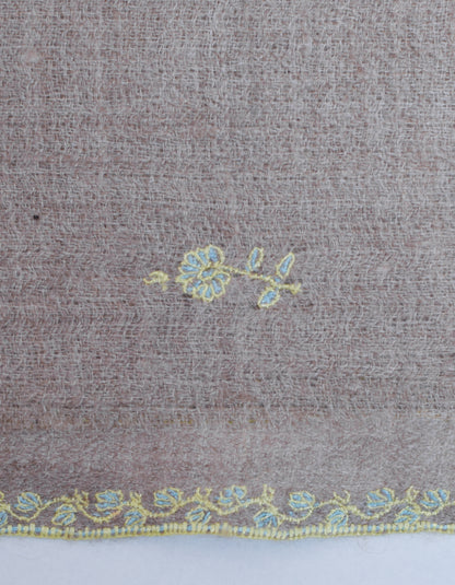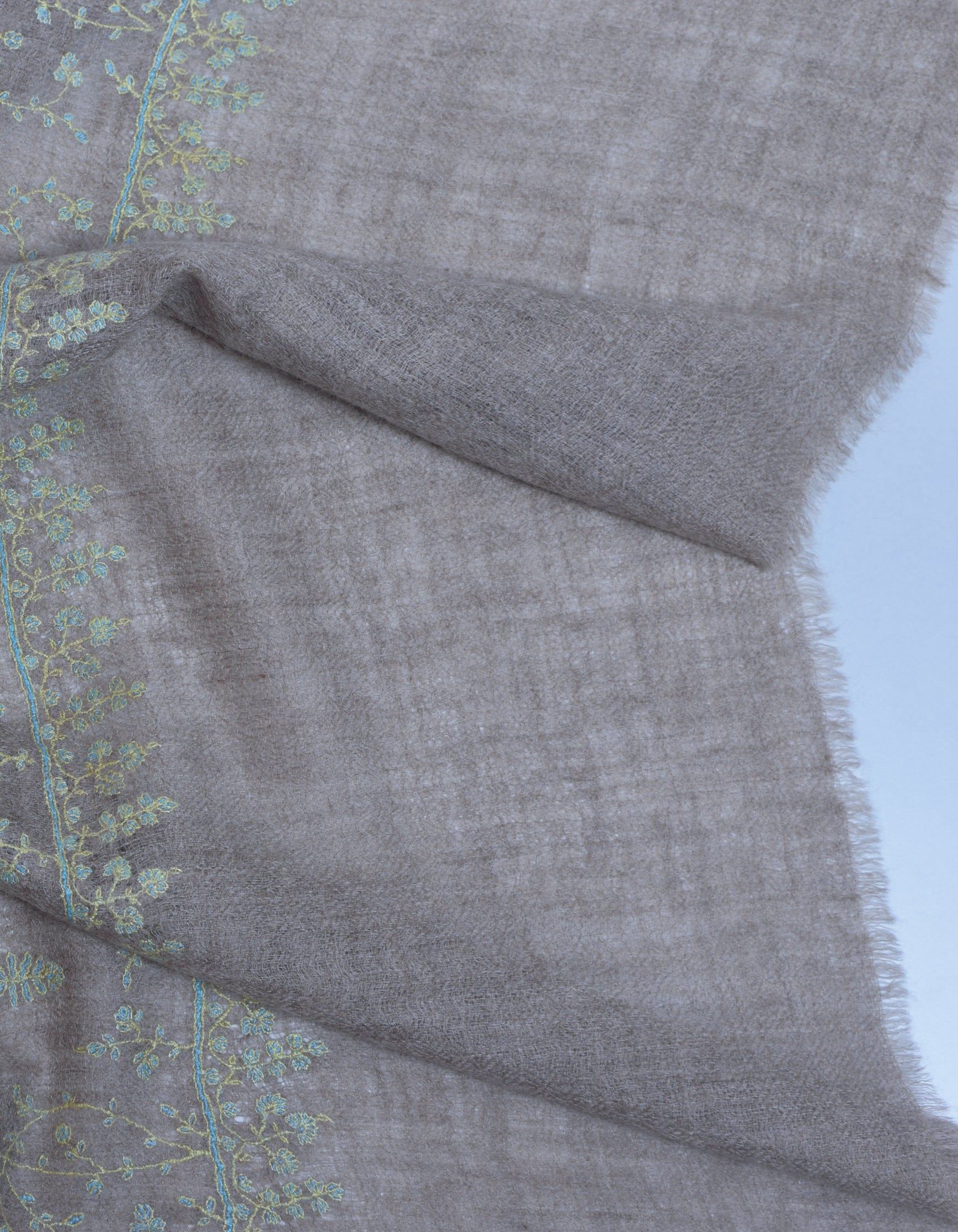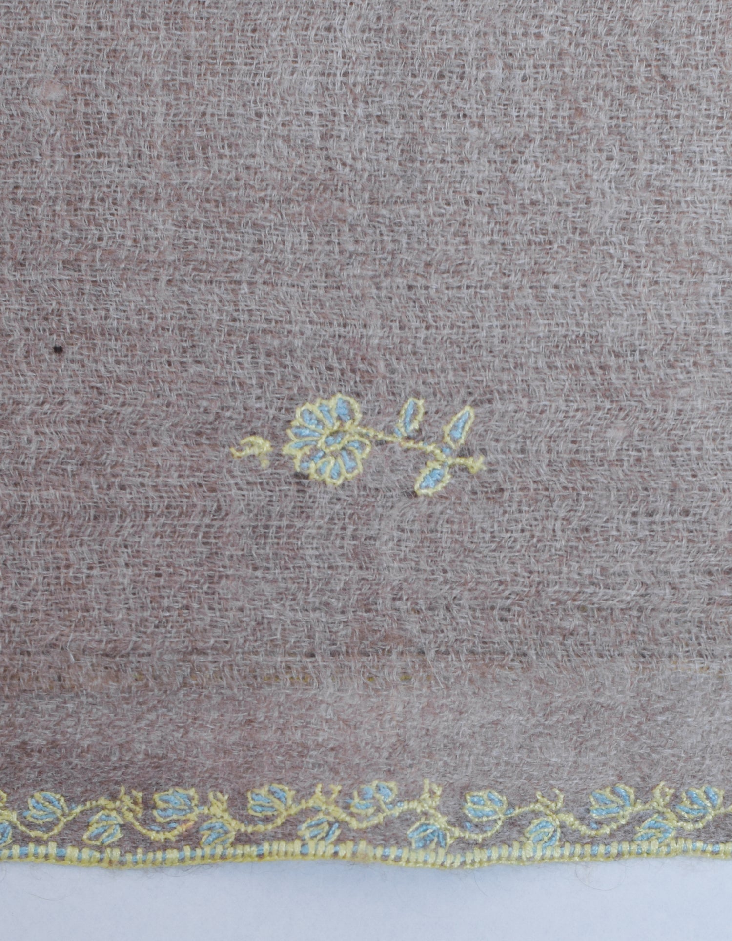 PRODUCT DESCRIPTION: Made from the finest cashmere, our pashmina is carefully handwoven on traditional handlooms, a painstaking process that demands both patience and skill. This stole features a beautiful pale khaki brown shade, adorned with delicate small floral bootis scattered throughout the field and a floral jaali border at the palla. The lower border showcases downward-facing florals, all embroidered in soft yellow and baby sky blue. The four edges are adorned with fine floral patterns, adding an extra touch of grace. It is a legacy of artistry that transcends time, making every moment special and luxurious.