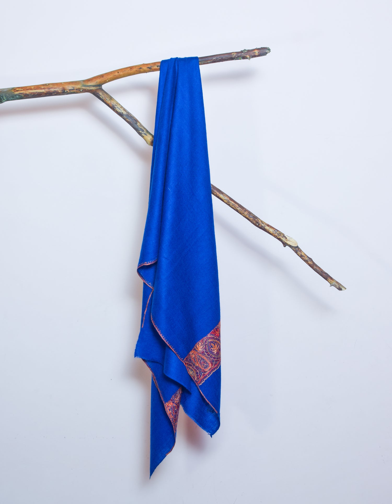 PRODUCT DESCRIPTION: A perfect blend of royal grace. Woven by the skilled hands of Kashmiri artisans, this rich royal blue cashmere pashmina celebrates true beauty. Just one look brings a sense of pure bliss. Made with love and patience on traditional handlooms over months, the soft cashmere wraps you in warmth and comfort like no other—a gentle reminder of the tradition and artistry in every thread. The shawl features a delicate border design along the side length, with a richly embroidered palla in multicolour, showcasing alternating chinar and paisley motifs.