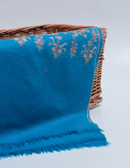 PRODUCT DESCRIPTION: An art that has been passed down through generations, one thread woven over another, and then another—this is how it goes. Crafted on a traditional loom, every strand of this luxurious deep sky blue pashmina tells the story of skilled artisans who dedicate months to creating a stole that exudes warmth and grace. It features delicate floral sozni embroidery along the length of the sides and a heavily embroidered palla in multicolour. This pashmina offers unmatched versatility; a simple flip over the shoulders transforms your look, making it perfect for any mood or occasion.