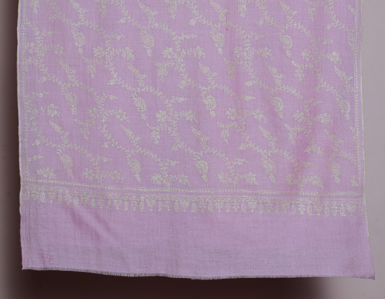PRODUCT DESCRIPTION: A feminine grace with a soft glow! This cashmere pashmina shawl, in a soft baby pink shade, is a luxurious accessory, handwoven from the finest pashmina wool and expertly crafted by skilled Kashmiri artisans. The light buttercream jaali embroidery features floral and paisley designs surrounded by a delicate thin border, and the design concludes with alternating floral and paisley patterns at the palla. Designed for the modern woman who appreciates a graceful, classic look, its complementing colours add a touch of sophistication. Wearing this shawl feels like draping a beautiful statement across your shoulders. Let this comfort accompany you wherever life takes you!