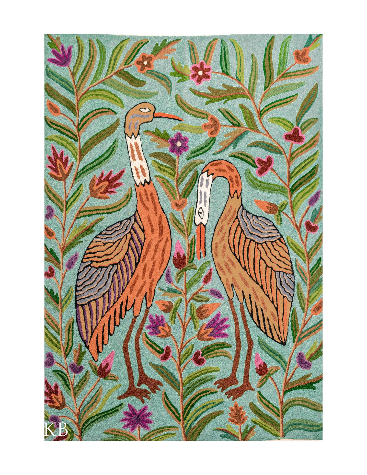 DESIGN DESCRIPTION : A Kashmiri craft inspired by tropical bird illustrations with a touch of folk or naive art. The design features two long-necked birds, likely herons, surrounded by tropical plants. The pattern covers the entire space, creating a naturalistic feel, with the birds slightly off-centre for a more natural look.
