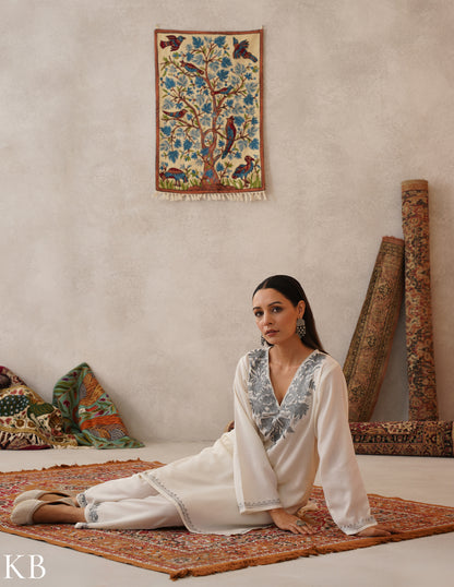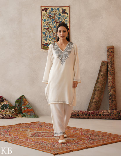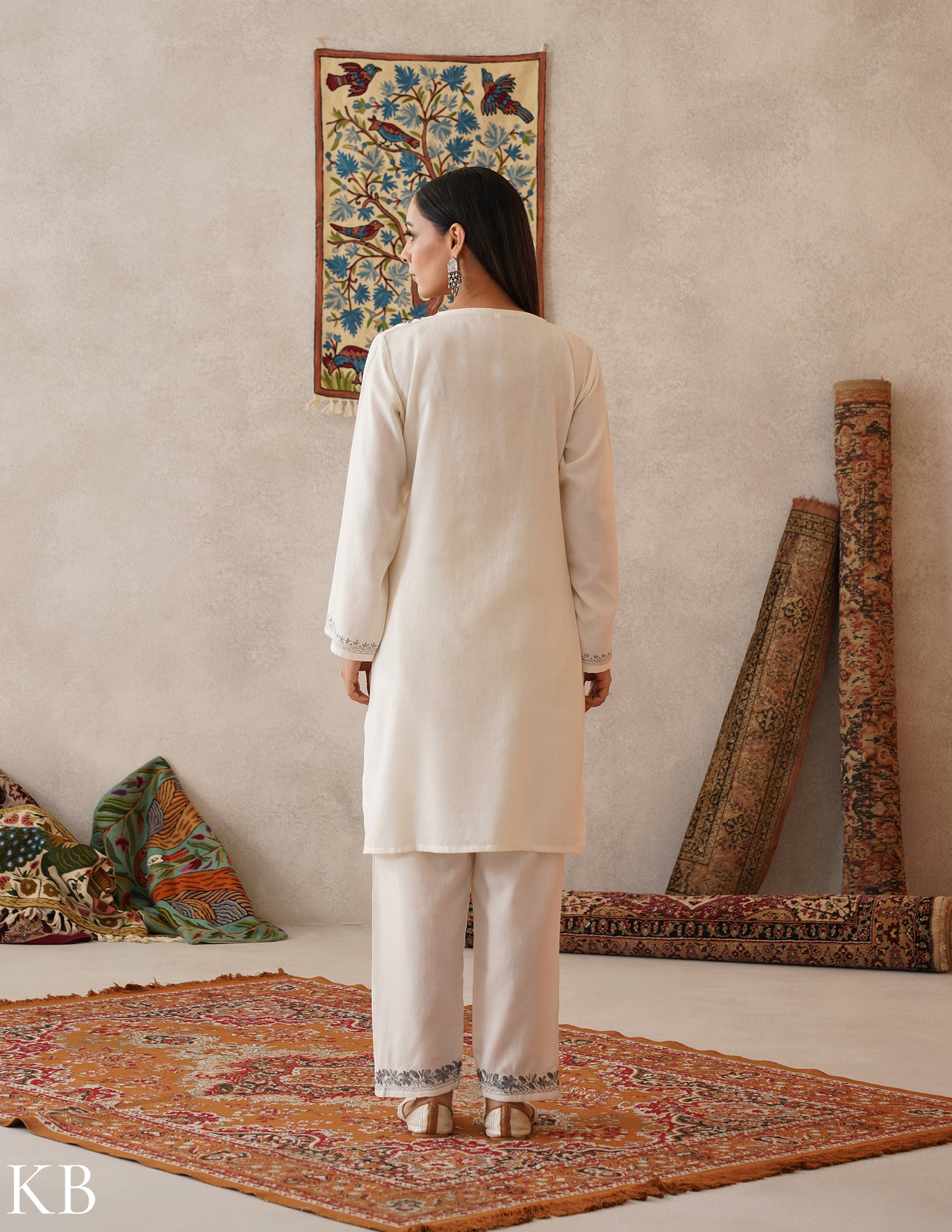 meHER Cream White Kashmiri Silver Zari Woollen Co-ord Set