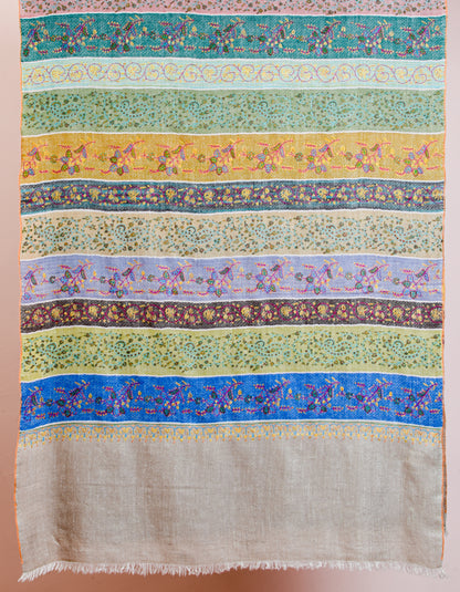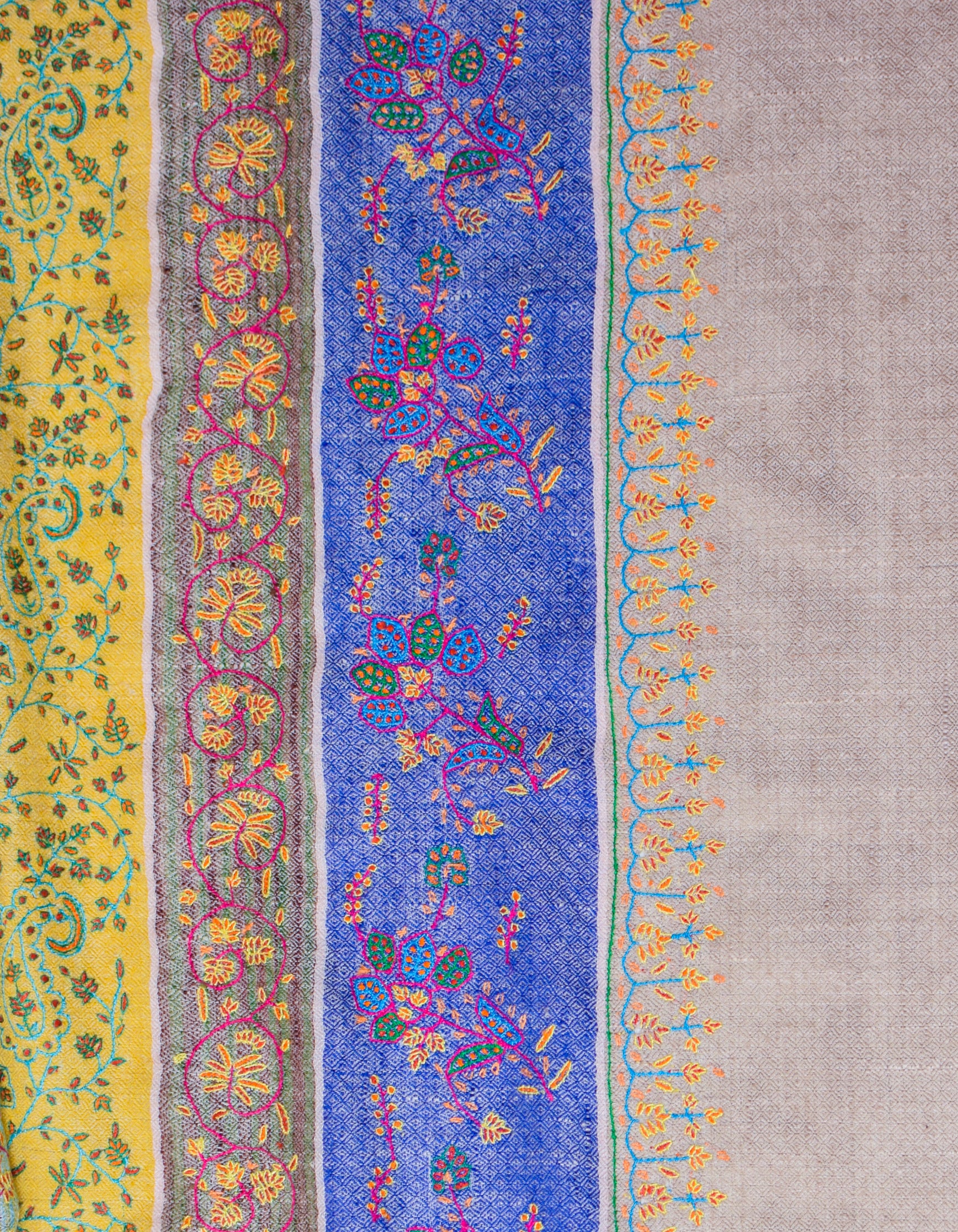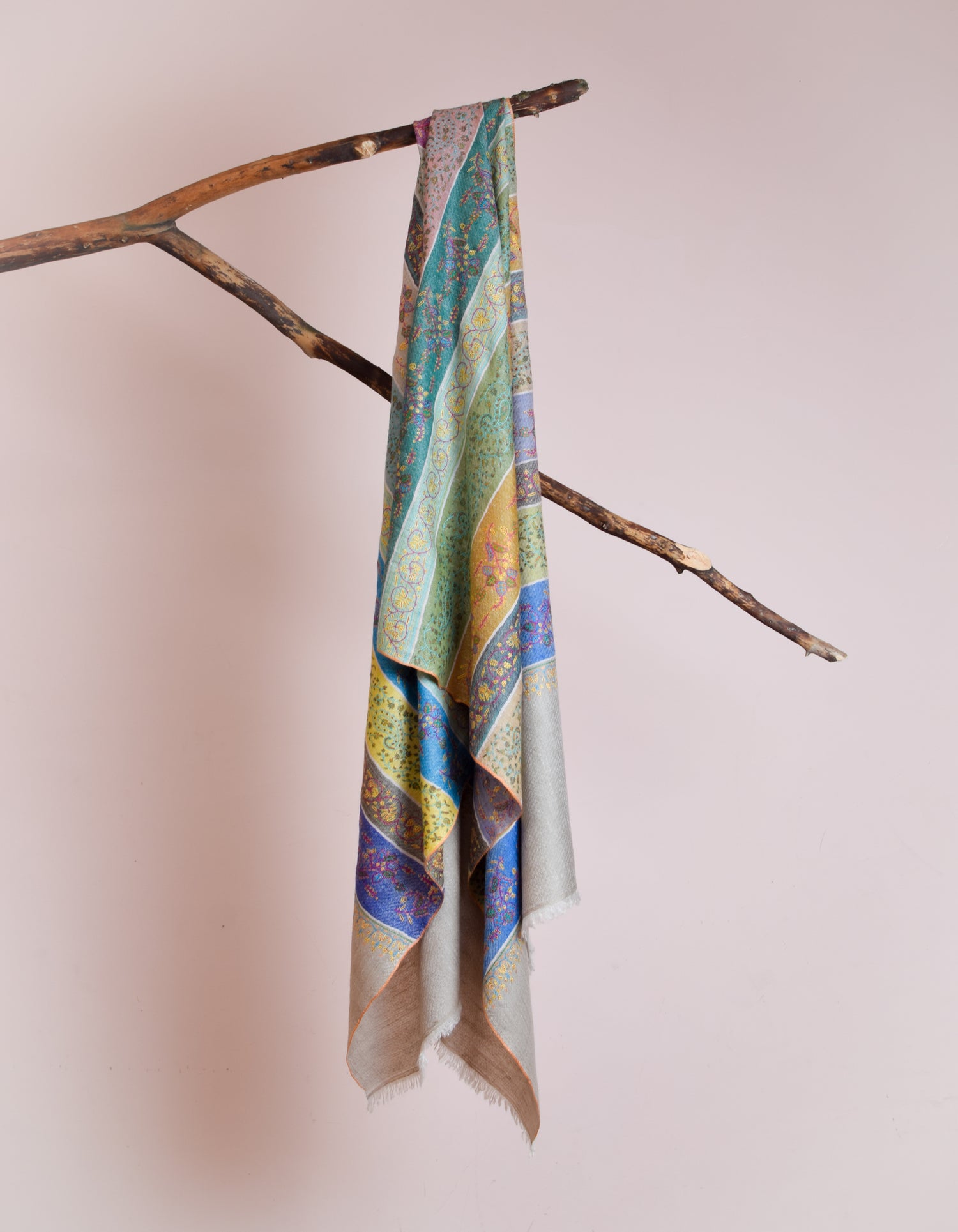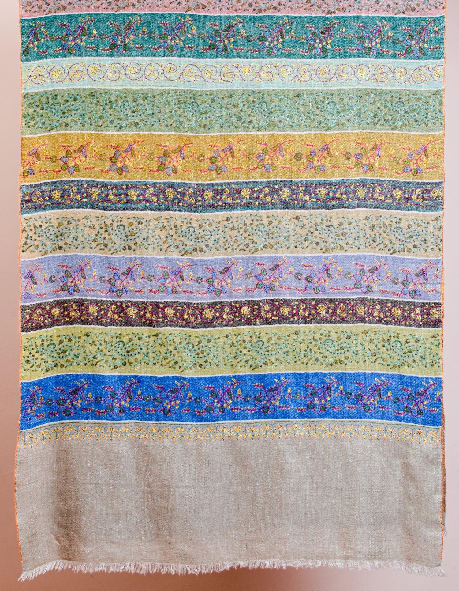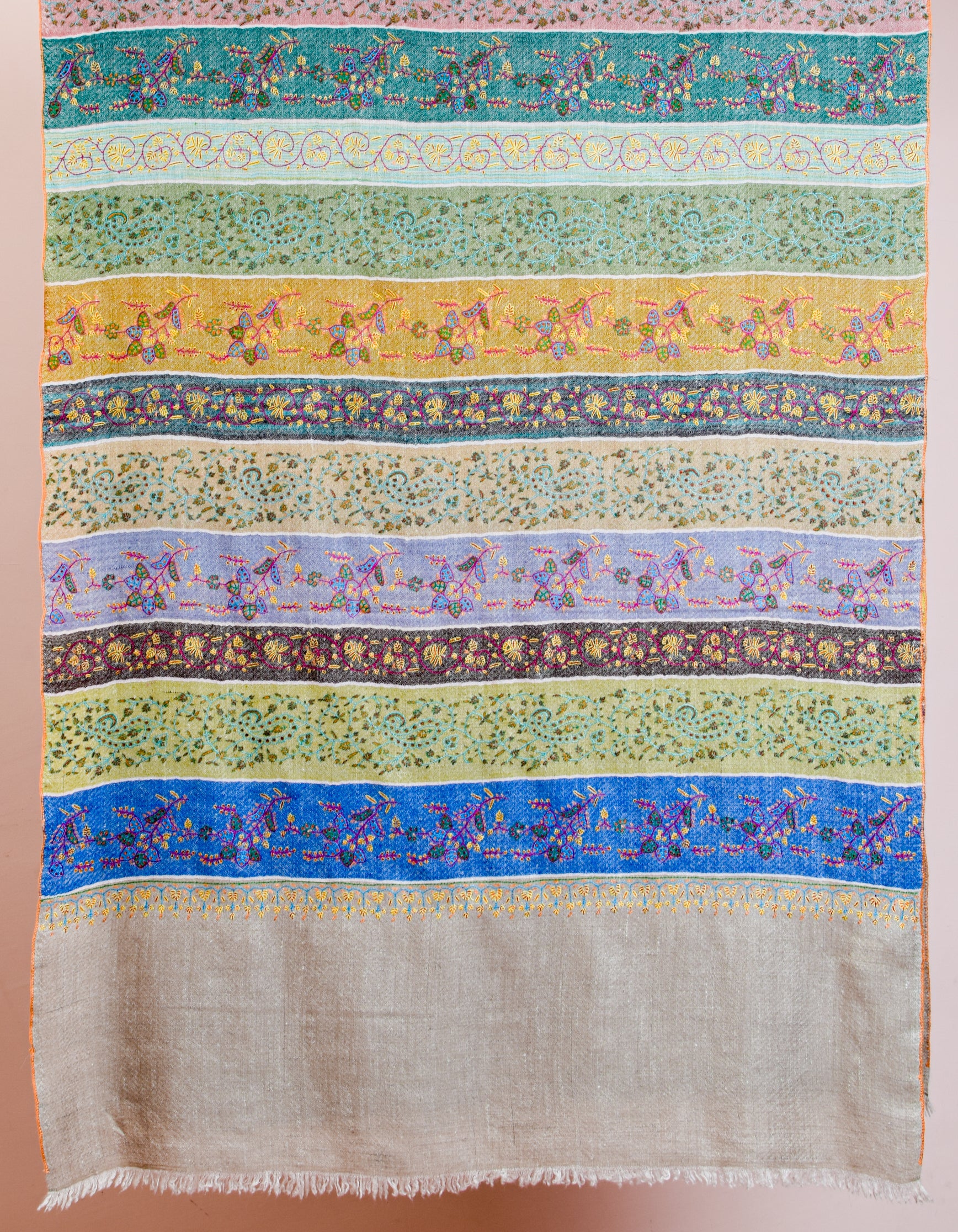 PRODUCT DESCRIPTION: A modern pashmina striped stole carries the spirit of the Kashmiri artisans who created it. Crafted on a traditional handloom, these artisans, with their skilled hands, weave together the colours of the softest cashmere. The beauty doesn’t stop there! This piece is finely sozni embroidered, featuring intricate floral and paisley designs. Every detail is painstakingly crafted by hand, bringing the fabric to life with multiple colours and patterns that repeat in perfect symmetry.