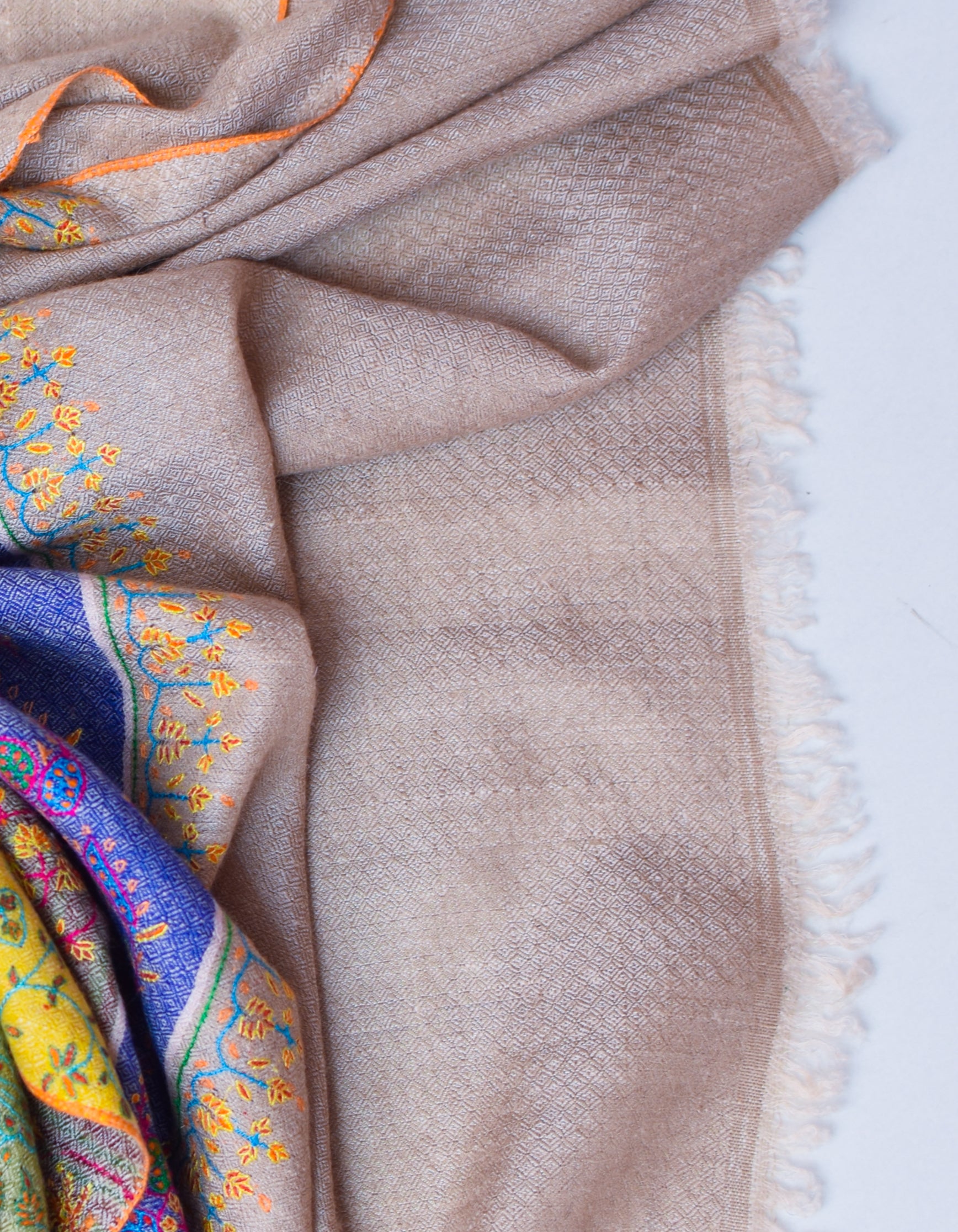 CRAFT FORM : Woven on a handloom and adorned with fine sozni needle embroidery, crafted using traditional Kashmiri techniques.