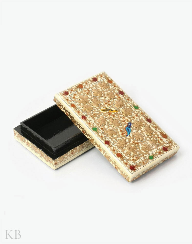 Crafted in the realms of one of the most deft craft - paper mache - where waste paper is transformed meticulously into colourful and beautiful masterpieces, the box is set to illuminate your home decor in the most classy way. The box is given a wooden base to provide it strength, which is covered with the processed waste paper, over which a naqash or painter paints a beautiful, bright gold vine spanning its leaves all over the plain white surface, and two bright hued birds chirping the rhythms of delight. The box can be used for storage or simply as shelf decor to set your interiors class apart.About Paper MachePaper Mache is a delicate decorative art, born in Persia and brought to Kashmir by a Prince who spent years in a prison at Samarkand in Central Asia. The surroundings harnessed the creativity and romance for this art and finally Paper Mache took its roots in the simple homes and thus a new art form was born. Paper Mache became the folk art of Kashmir; passing down from father to son, from generation to generation. Paper Mache involves two main steps: Sakhtsazi is the actual production of the item and Naqashi is when the item is painted with any number of motifs.