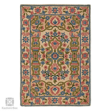 These rugs evoke the nostalgia of a bygone era, with around 200,000 stitches in each one, all lovingly handmade by skilled Kashmiri artisans. These treasures, though influenced by other cultures, have been cherished and adapted to hold Kashmir’s culture and beauty, as if they were always a part of Kashmir’s own heritage.