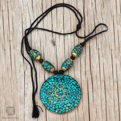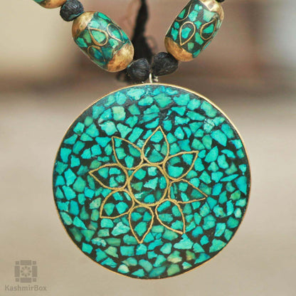 In an attempt to revive the age old craft of Kashmiri Turquoise, which has remained forgotten in history and time, is handcrafted this beautiful piece of jewelry. The neck piece is made from pure Pashm Stones of Ladakh, which are ground and heated and embedded over the spectacular beads which are then threaded to form a piece which is appealing and grand in its demeanor. The neck piece features a starry design over a base which has been painted a mesmerizing and soothing shade of blue. The prominence of the color lends its name to the craft and only deepens as time passes. With only 5 families left to craft these explicit statements of extravagance, get your Turquoise necklace home today!
