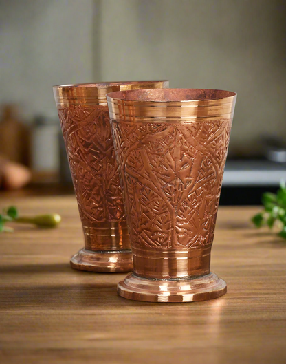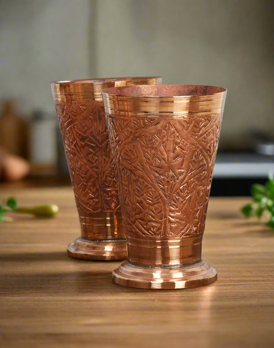 It is time to bring back the culture of the Valley and get back to the tradition of drinking water in the classically designed Copper glass. The glass reflects the symbol of royalty and luxury. Beautifully carved, the copperware sits high in the court of Kashmir Arts and Crafts, its mesmerizing coppery bronze hue casting a spell of grandeur in heritage inspired motifs. Kashmir Box brings back to the grandiose of copper ware in these glasses for you to rejoice the age old cultural heritage of Kashmir.