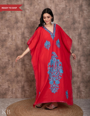 With an exquisite embroidery and detailing, handpicked is an airy light kaftan to keep its wearer comfy and stylish in the scorching hot summers. The Kaftan is blended in a pallette of light and bright tones as a large floral sprout, worked in the grace of Aari embroidery, sits proudly in the centre of its bright base. With the crushed cotton adding a perfect casual touch to it, the kaftan makes for a truely timeless and ethereal aestheticAbout AariAari Kari is a fascinating hook art done in silk and cotton threads. The embellishment follows an elaborate process starting with the Naqash who traces nature inspired motifs over plain pieces of cloth. The imprinted fabric is then passed onto a Kaarigar (artisan) who uses a specialized hook called Aari, to embroider it. Typically done on suits, shawls and bags, Aari kaem works its colorful charm on a plain drape and inspires in it a lively ethnic appeal