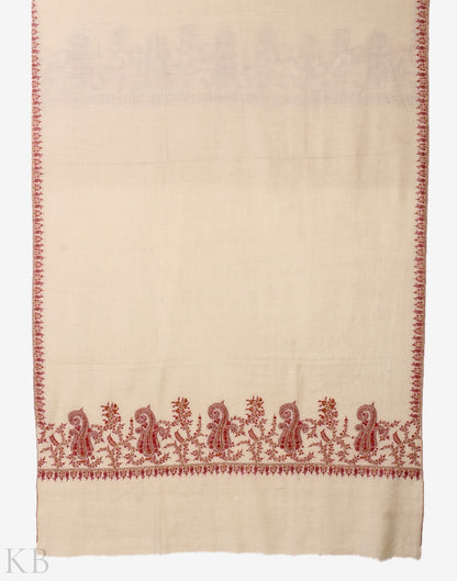 An Off White Pashmina Shawl has been ornated with Sozni Kaari on Pallas in paisley motifs with fine details and complex designs. Wrap sophistication around your shoulders and leave an impression forever.