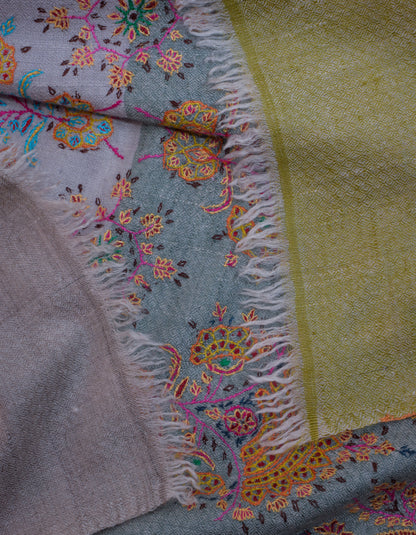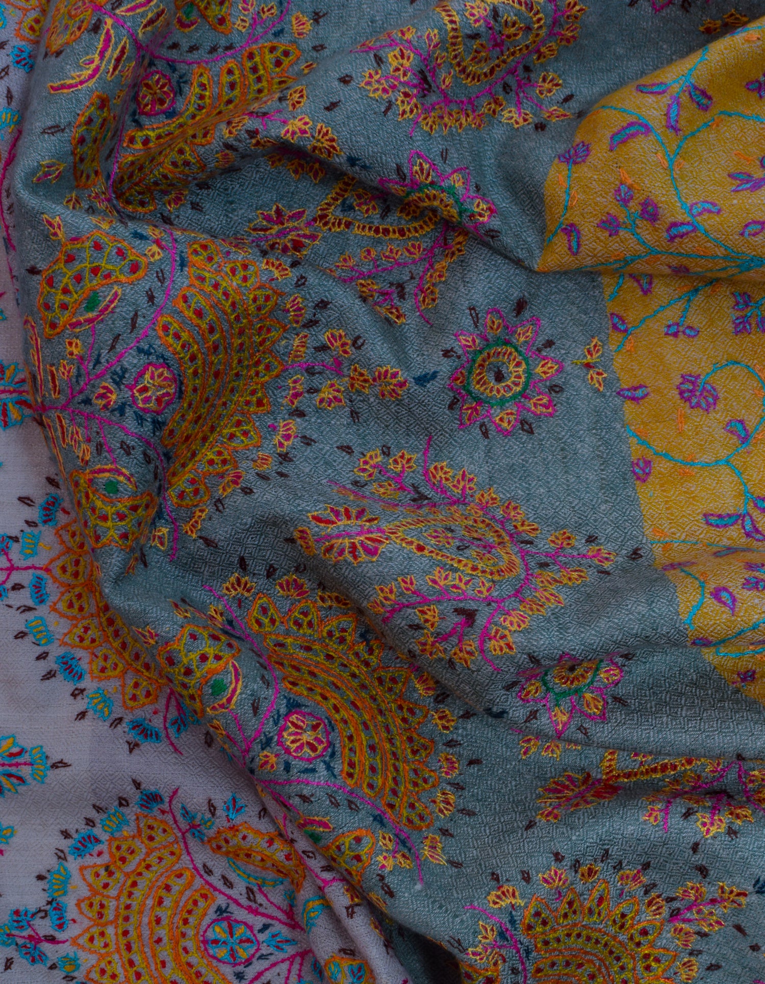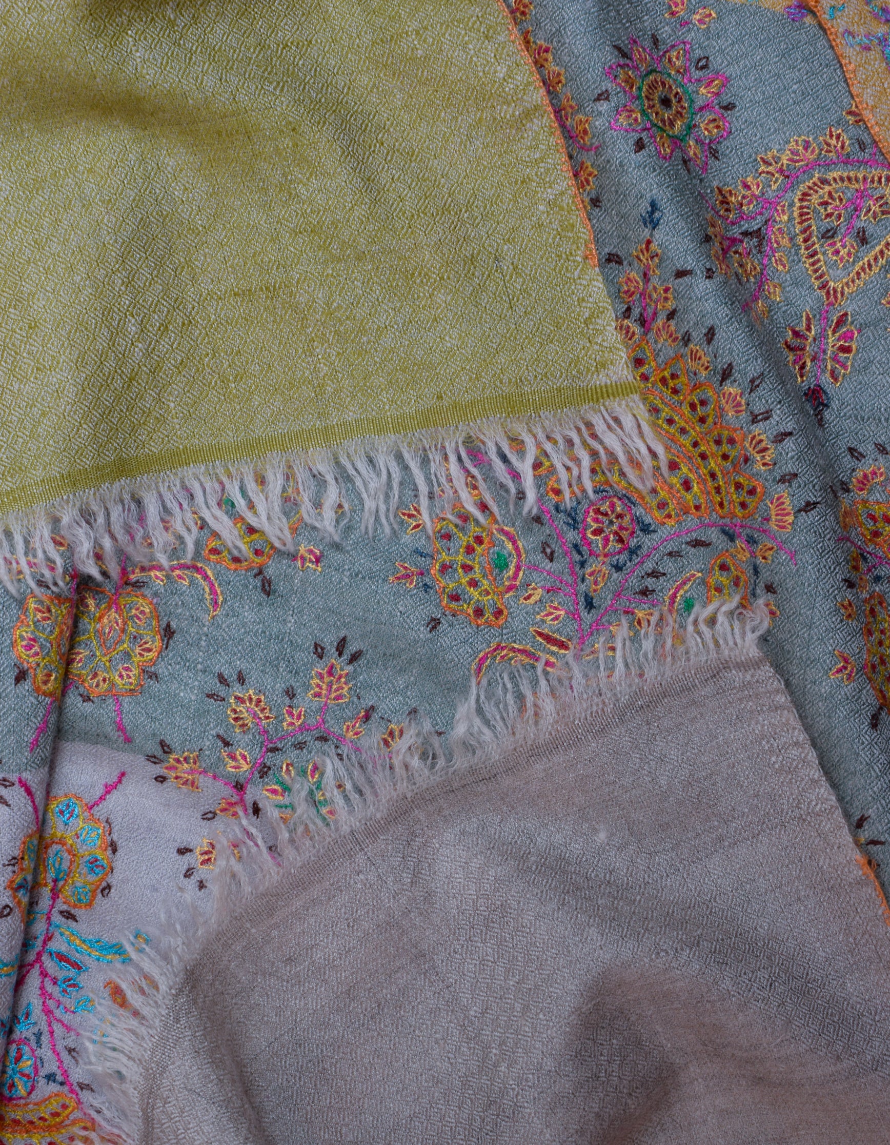 CRAFT FORM : Woven on a handloom and adorned with fine hand sozni embroidery, crafted using traditional Kashmiri techniques.