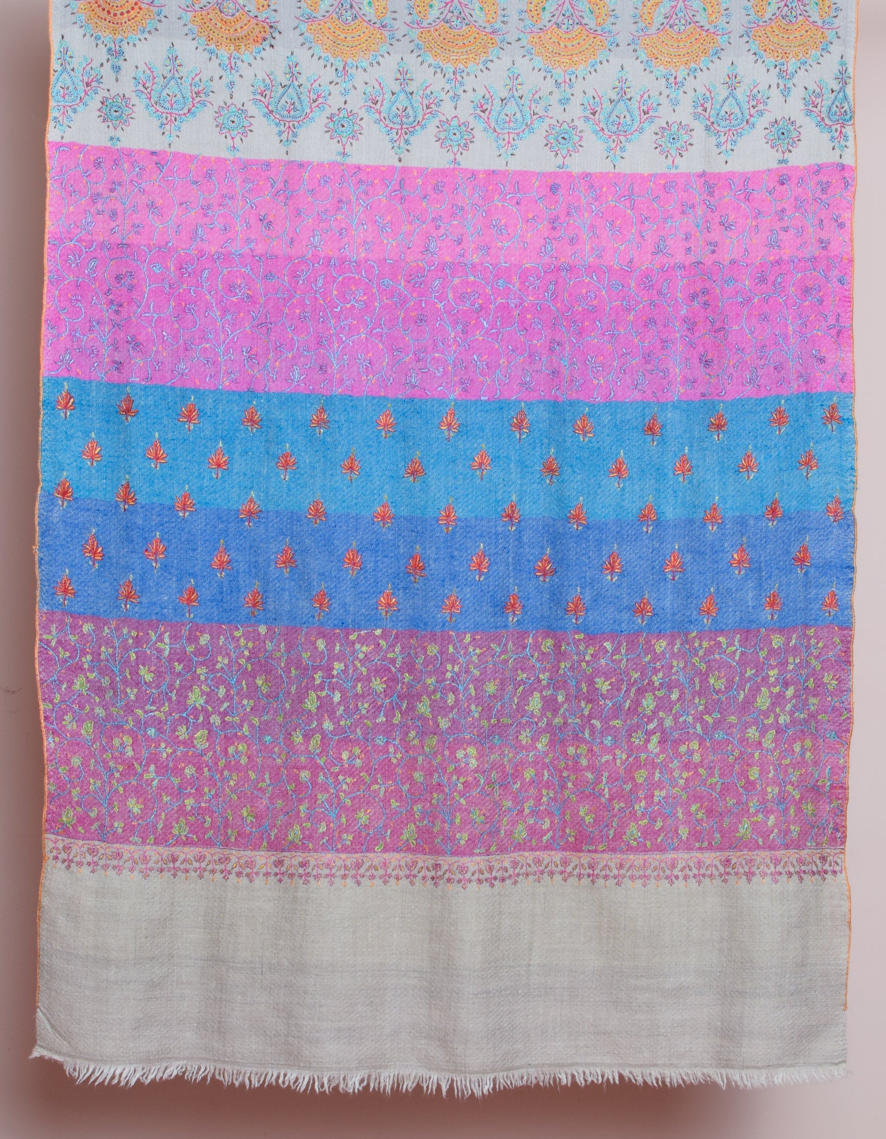 PRODUCT DESCRIPTION: Feel the connection to the hands that made this cashmere pashmina stole, featuring multicolour stripes adorned with a floral jaali, showcasing bouquets and bootis in various designs that repeat symmetrically. A beautiful, delicate border at the palla features floral embroidery that gracefully faces downward. Every inch of this cashmere stole carries the heritage of Kashmir. This stole is a labour of love, made with care and dedication. You deserve to wear something that tells a story—a story of tradition and artistry, something uniquely made for you.