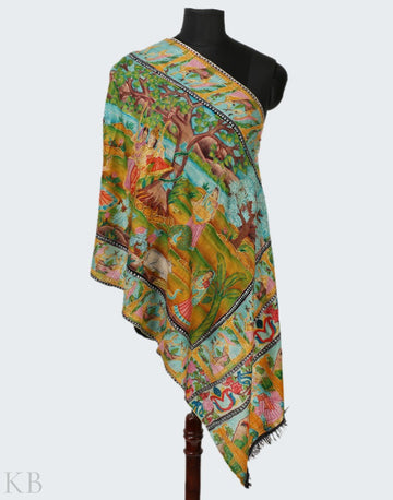 A Pashmina Stole is handpainted with a scene of expression of love between the two lovers with Sozni outlines narrating an amazing love story.
