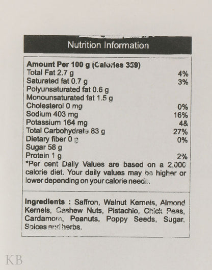 • Sugar, Spices, and Herbs: Carefully selected to complement the dry fruits and saffron, these ingredients add a subtle sweetness and a harmonious blend of flavors, making each bite a delight.