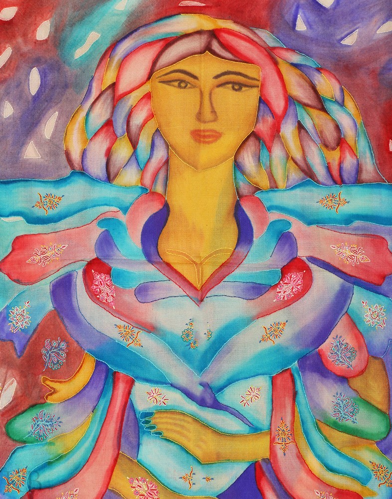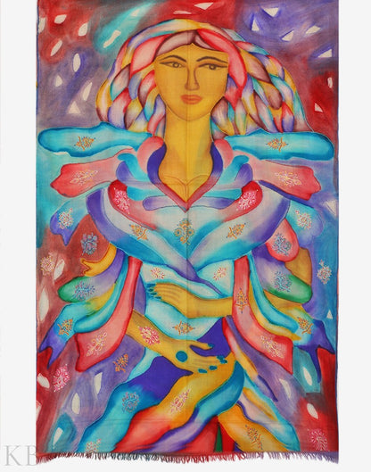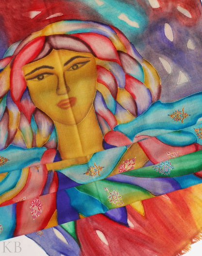 Multicolors are handpainted on regal Pashmina Stole with a beautiful girl face outlined by Sozni Embroidery. The mix and match of Sozni and Pashmina gives a royal look. Feel luxurious and exquisite in this Stole and get classy in its feel.