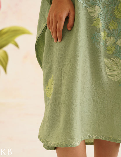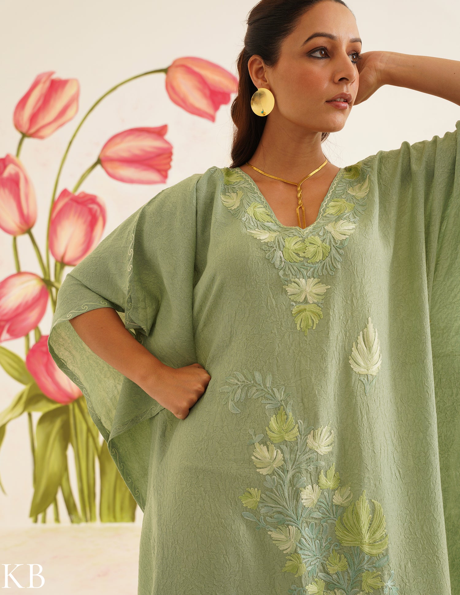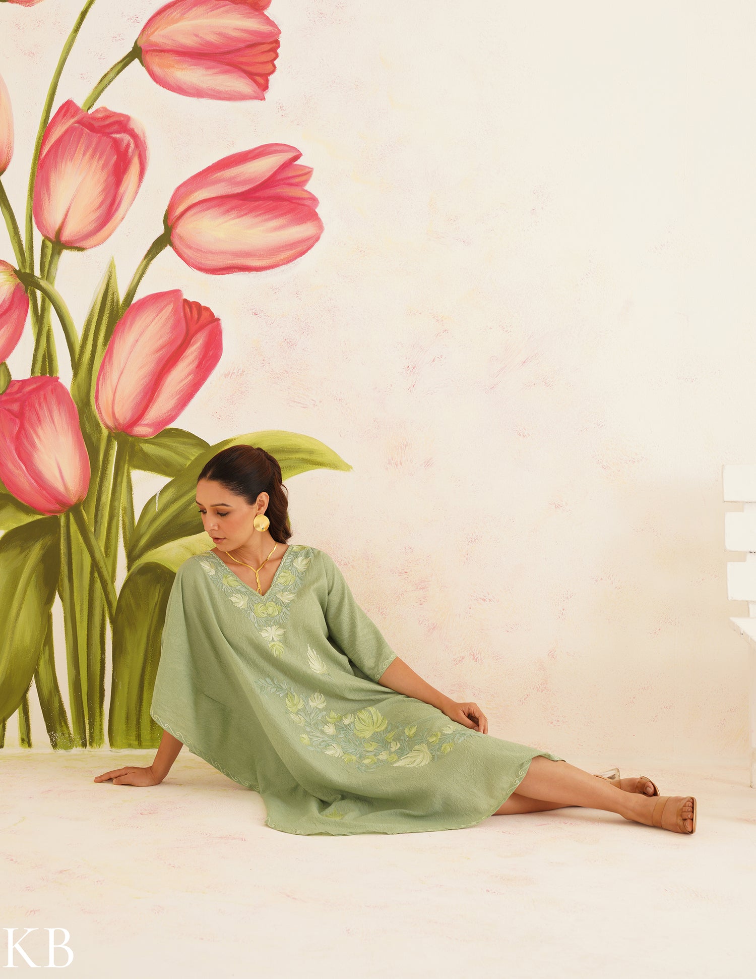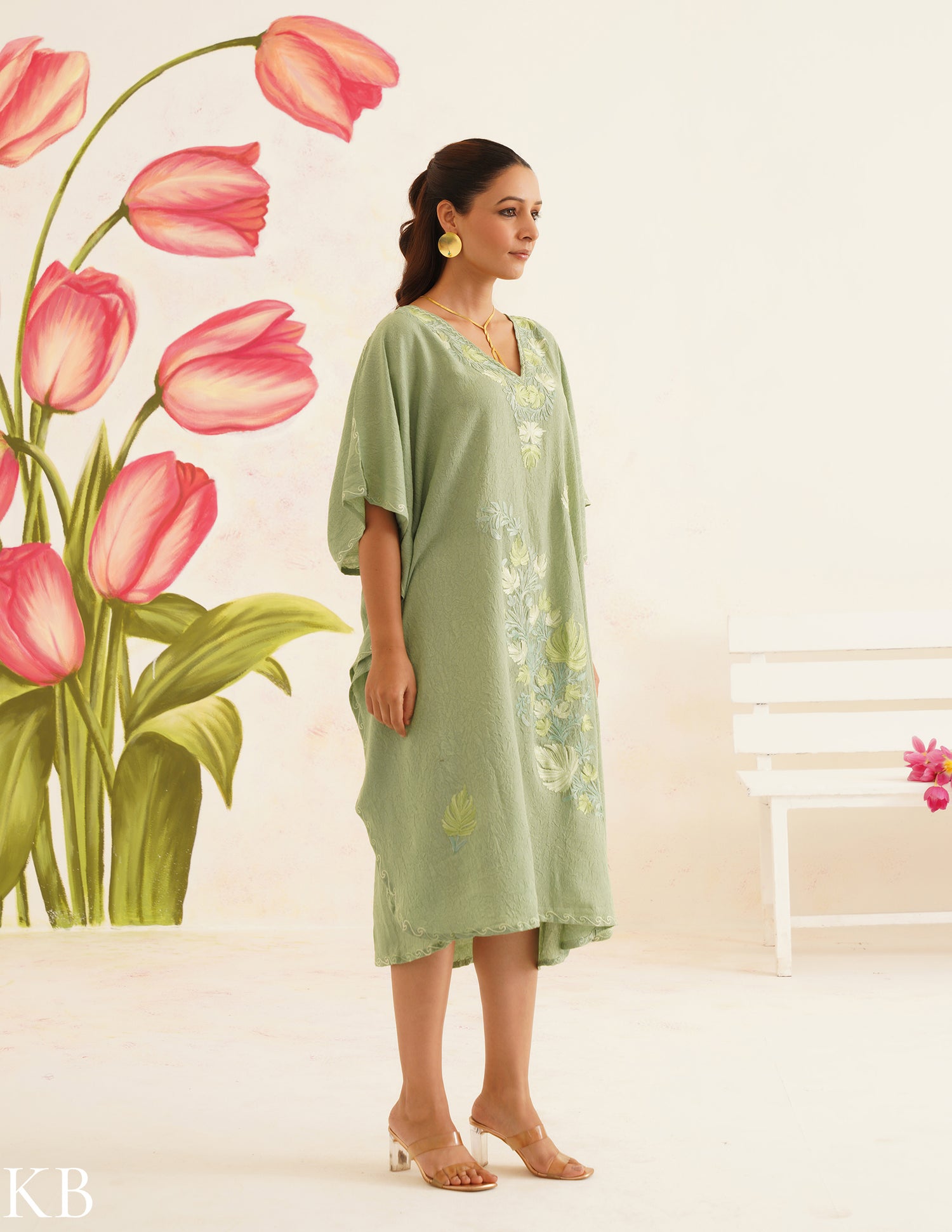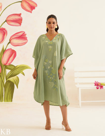 Sage Green Cotton Kaftan Dress with Tonal Embroidery | Comfortable Loose-Fit | Summer Ethnic Wear
