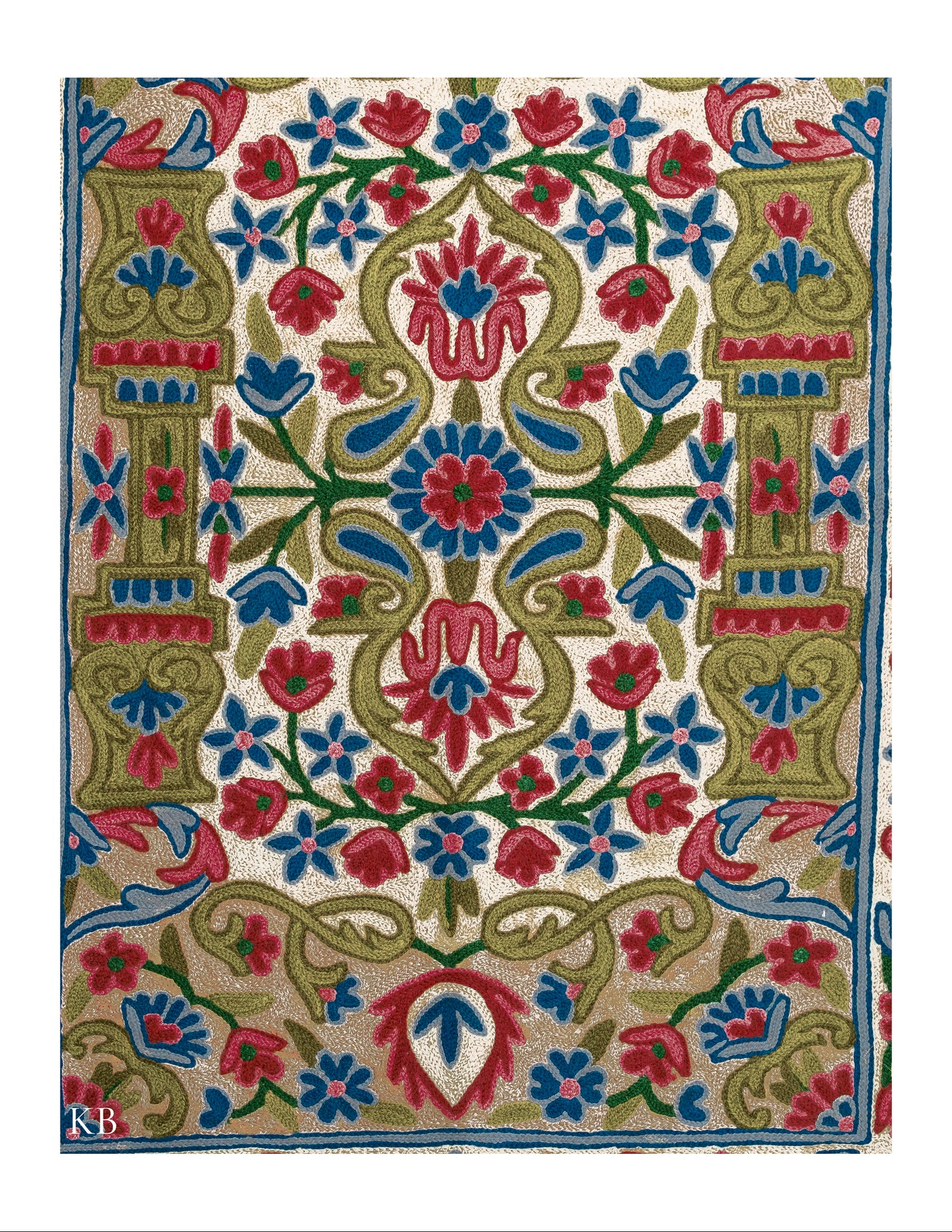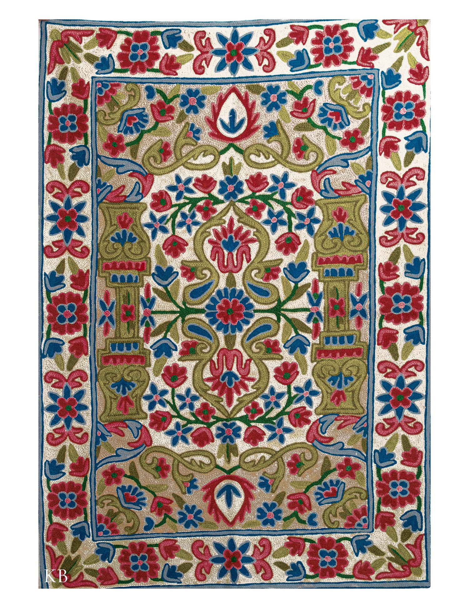 DESIGN DESCRIPTION : A lively flower garden brought to life with a handful of colours of thread. This rug features a detailed, decorative pattern in a rectangular shape, highlighted by a distinctive border and central design. Drawing inspiration from classic Persian and Mughal carpets, this design is beautifully adapted into the Kashmiri chain stitch style.