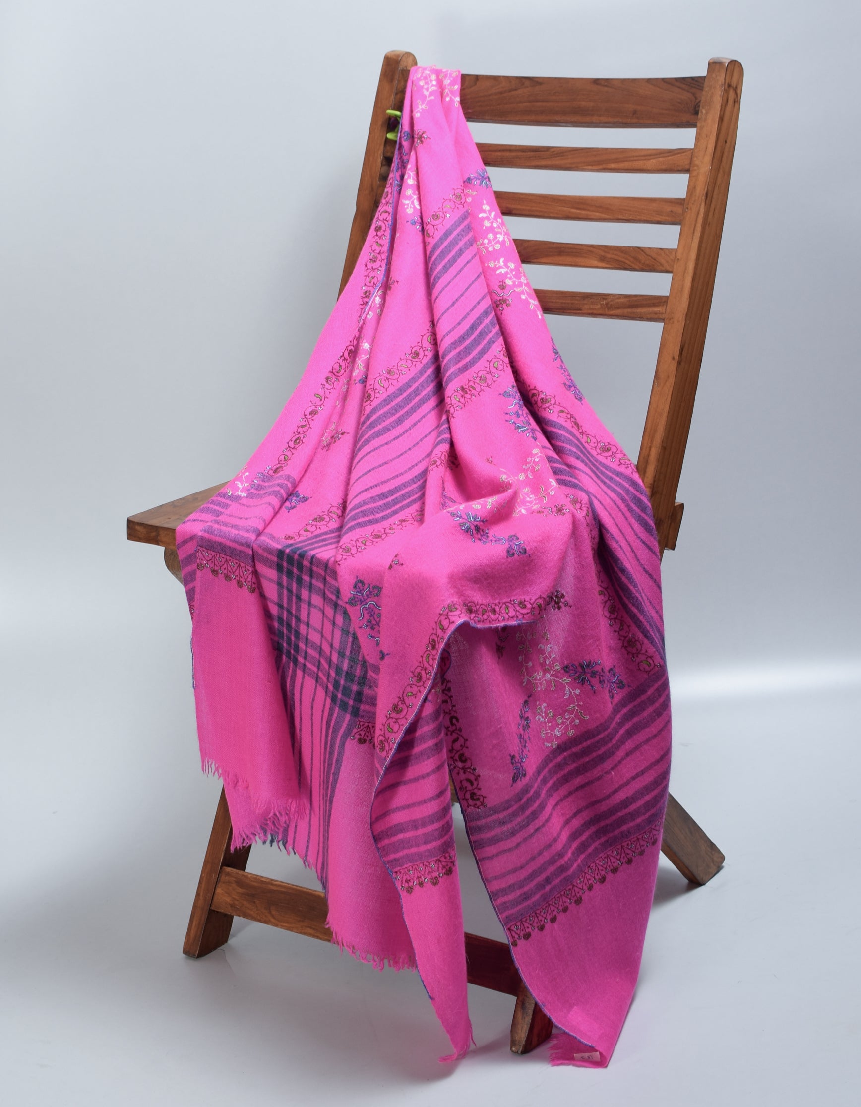 PRODUCT DESCRIPTION: An age-old art that has been preserved through generations. One thread is carefully woven after another—this is the spirit of craftsmanship. Created on a traditional handloom, each strand of this luxurious fabric tells the story of artisans who dedicate months to crafting warmth and grace. Featuring royal pink with light navy blue stripes at the centre and bottom palla, it is adorned with multicolor floral embroidery. A quick flip over your shoulders transforms your style, making it suitable for any occasion. A true reflection of the patience and precision found only in handcrafting.