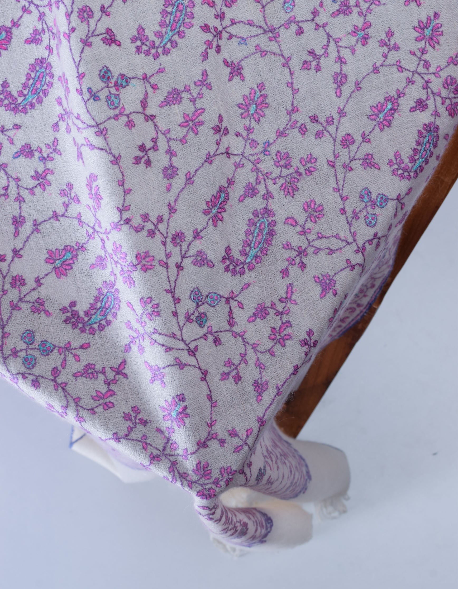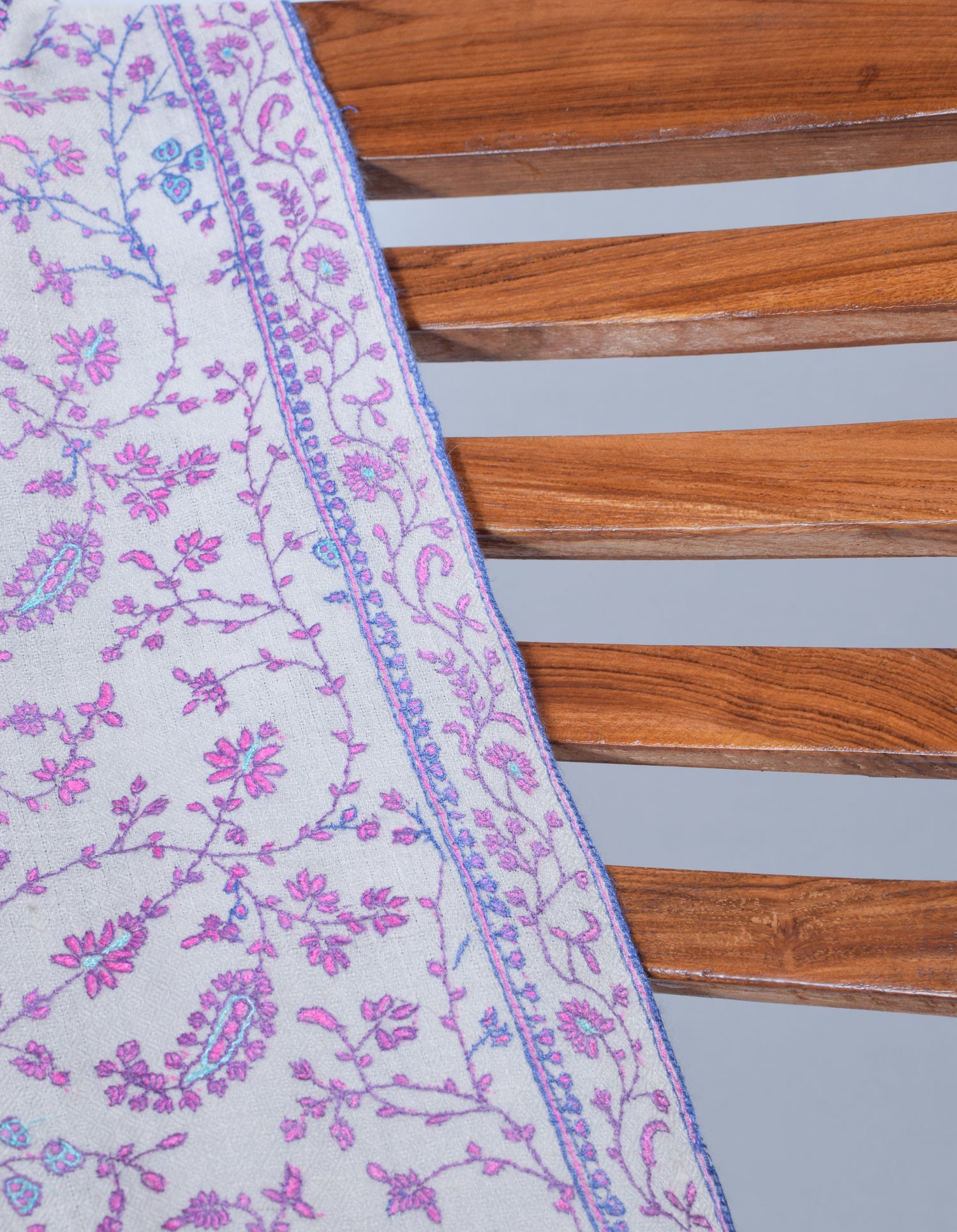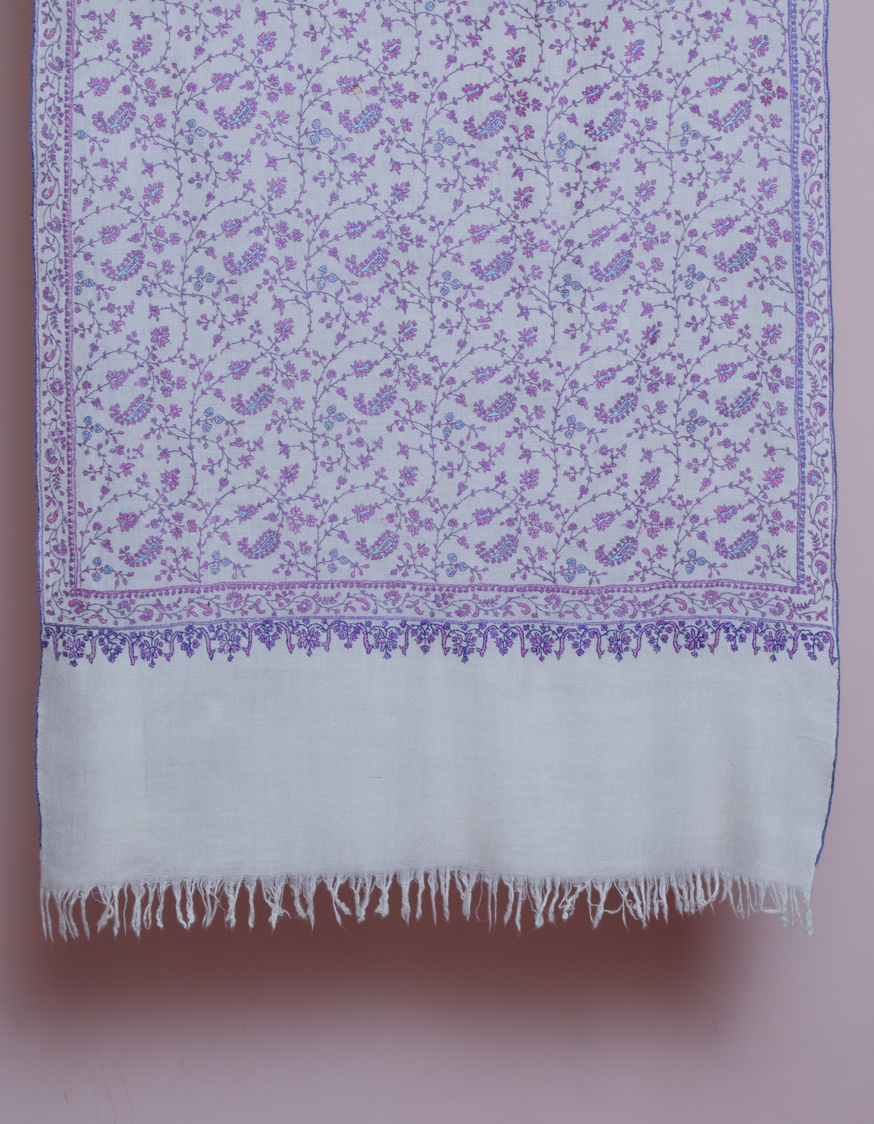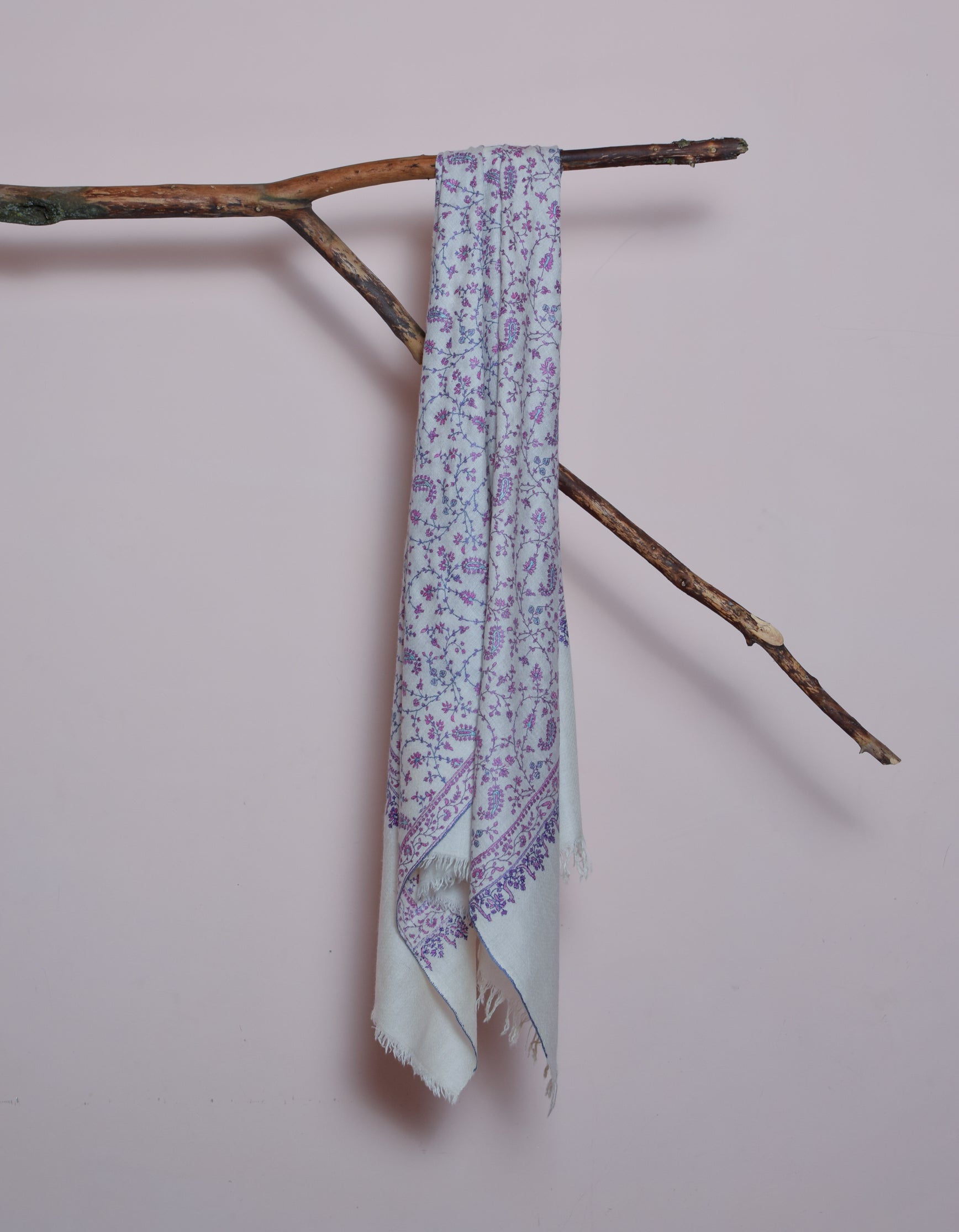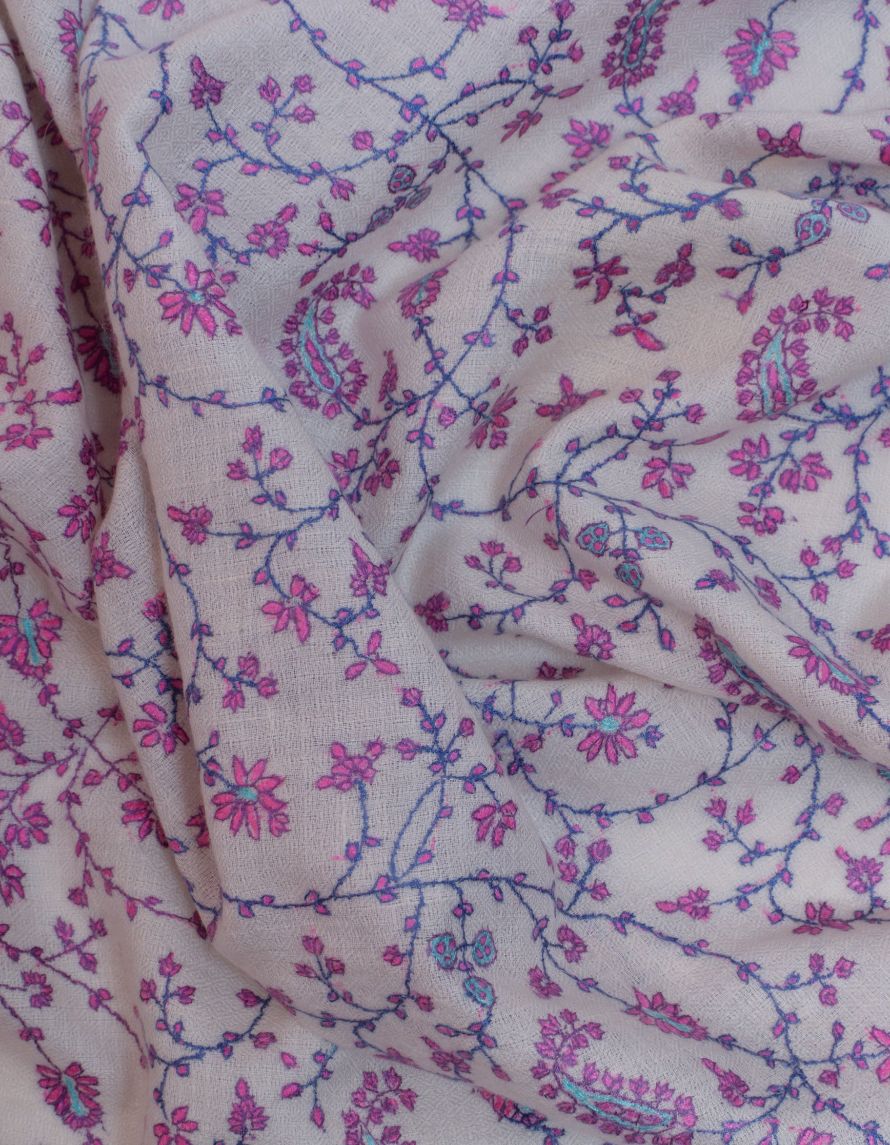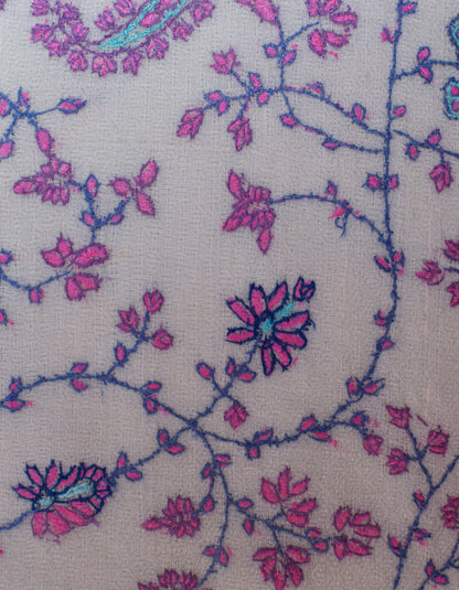 PRODUCT DESCRIPTION: A feminine grace with a soft glow! This natural cream cashmere pashmina stole is a luxurious accessory, handwoven from the finest pashmina wool and expertly crafted by skilled Kashmiri artisans. Adorned with jaali floral and paisley sozni embroidery in shades of pink and blue, the design features a floral border along all four sides. Designed for the modern woman who appreciates a graceful, classic look, its complementing embroidery colours add a touch of sophistication. Wearing this stole feels like draping a beautiful statement across your shoulders.