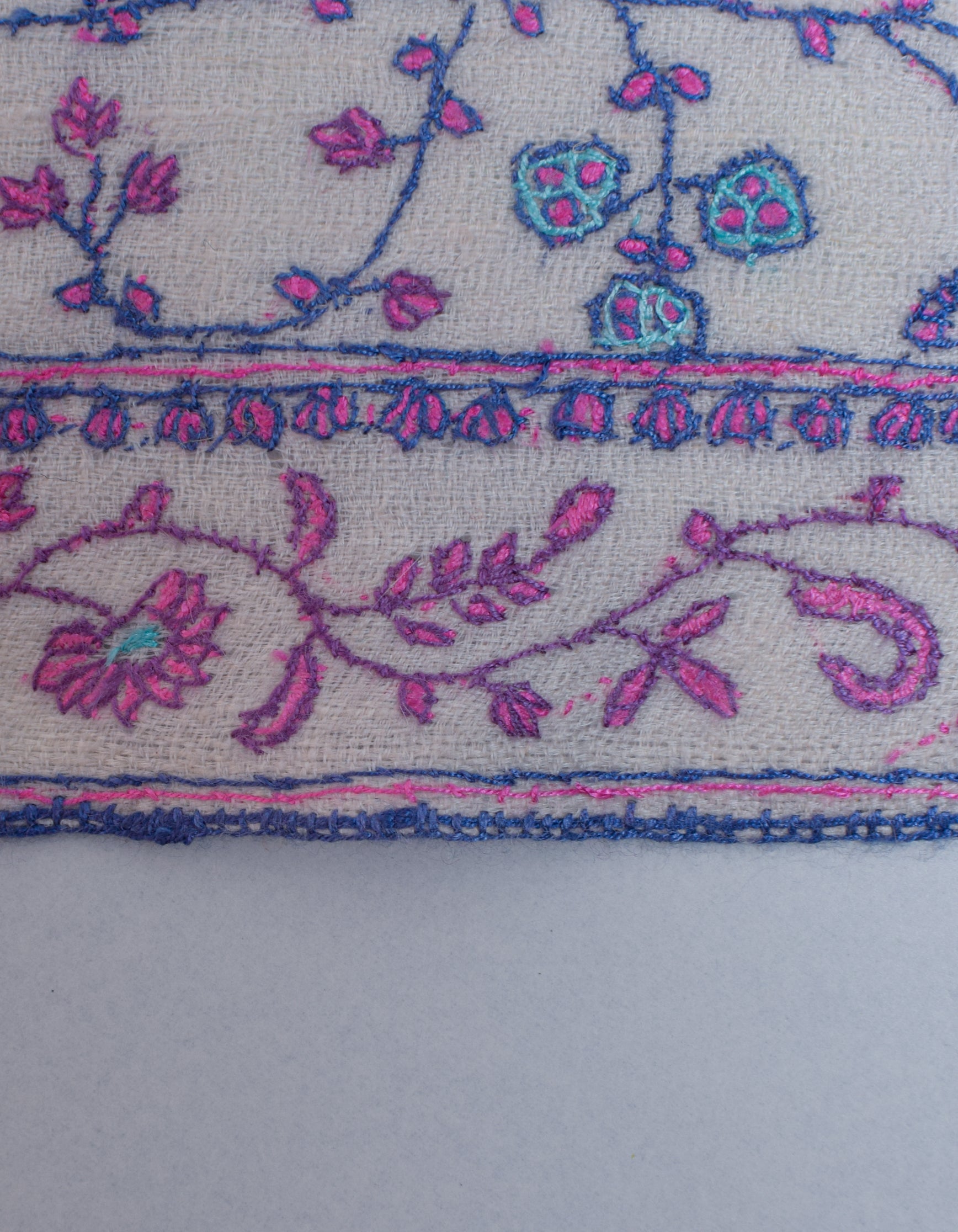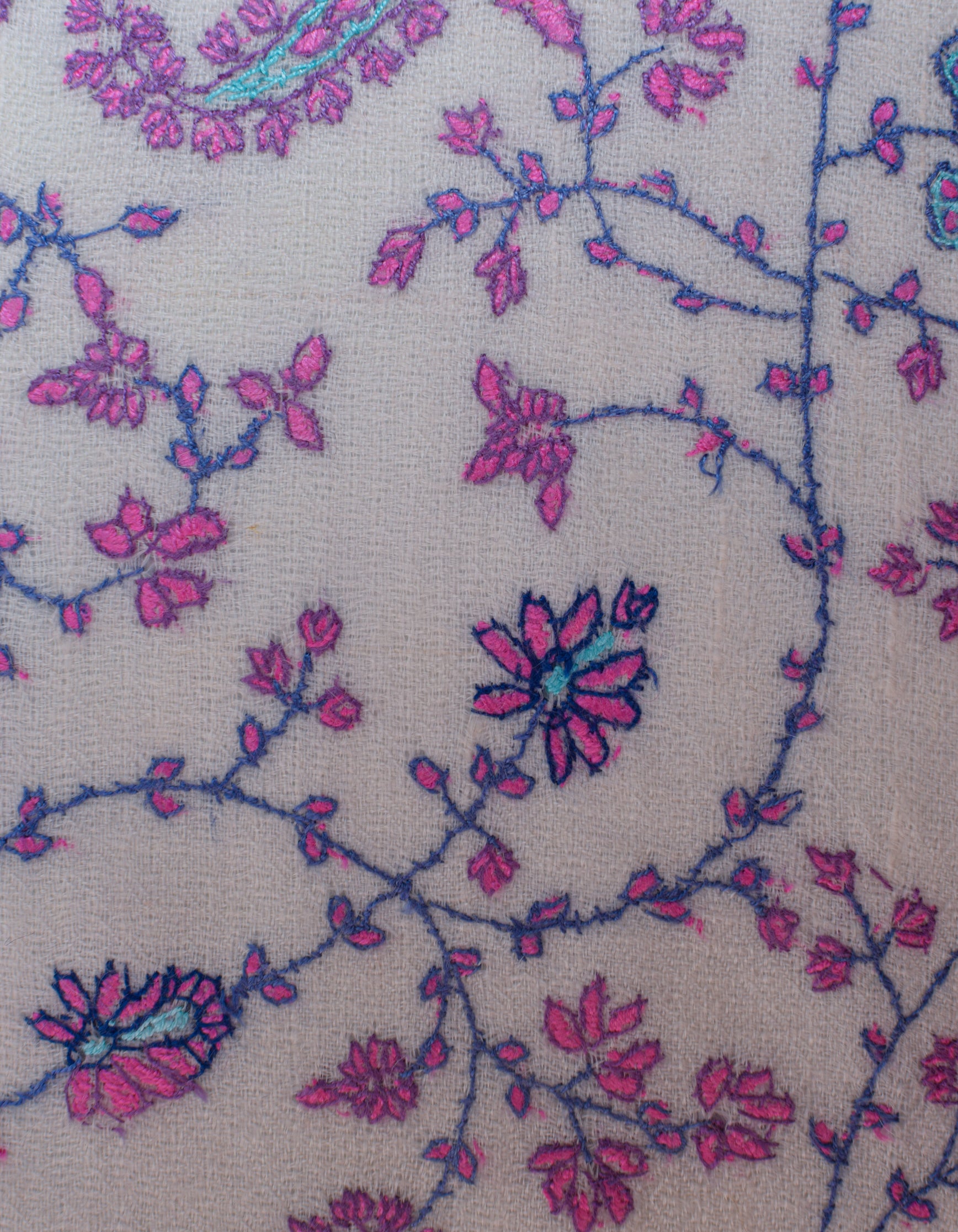 COLOUR: Natural cream pashmina adorned with sozni embroidery in shades of pink and blue.