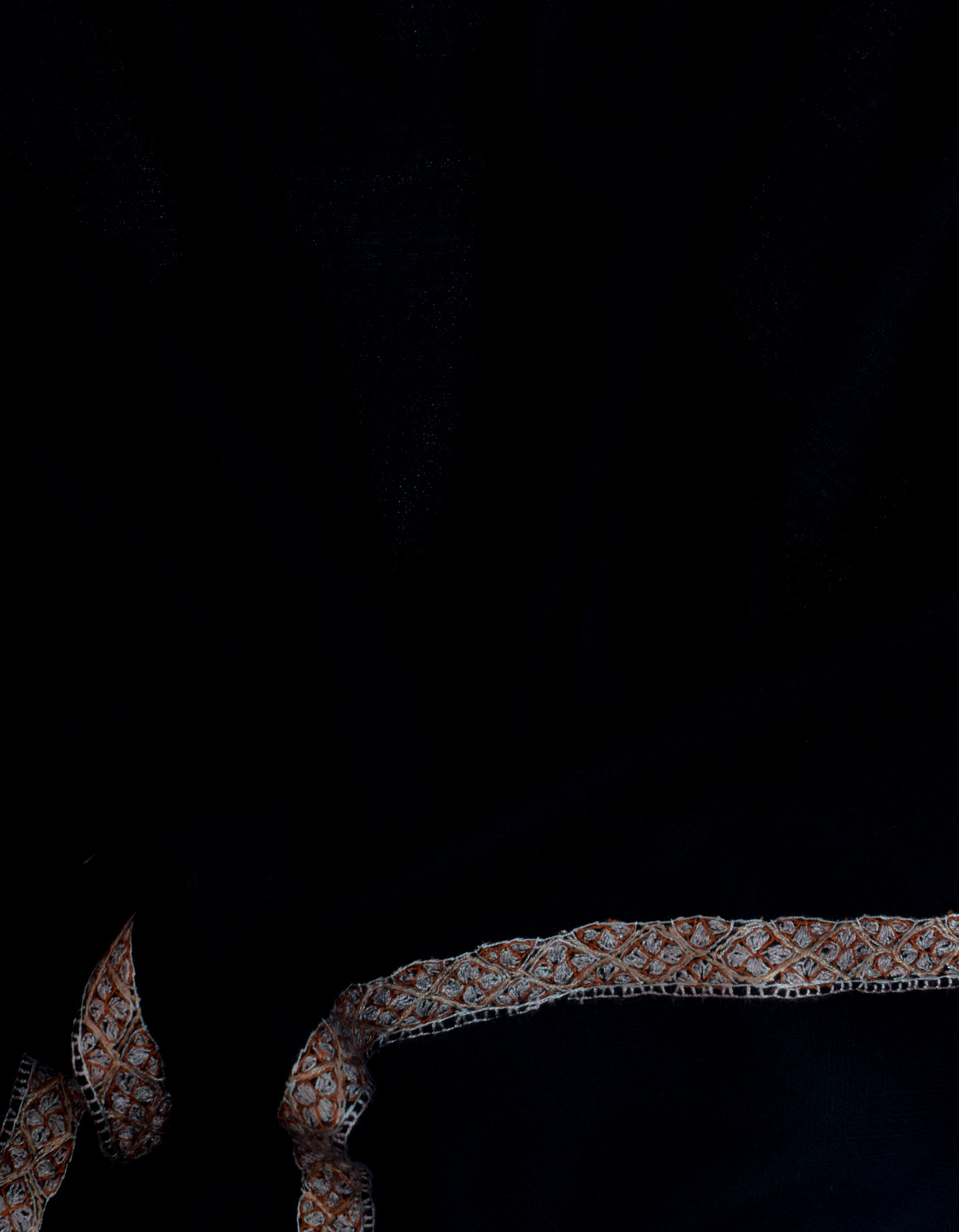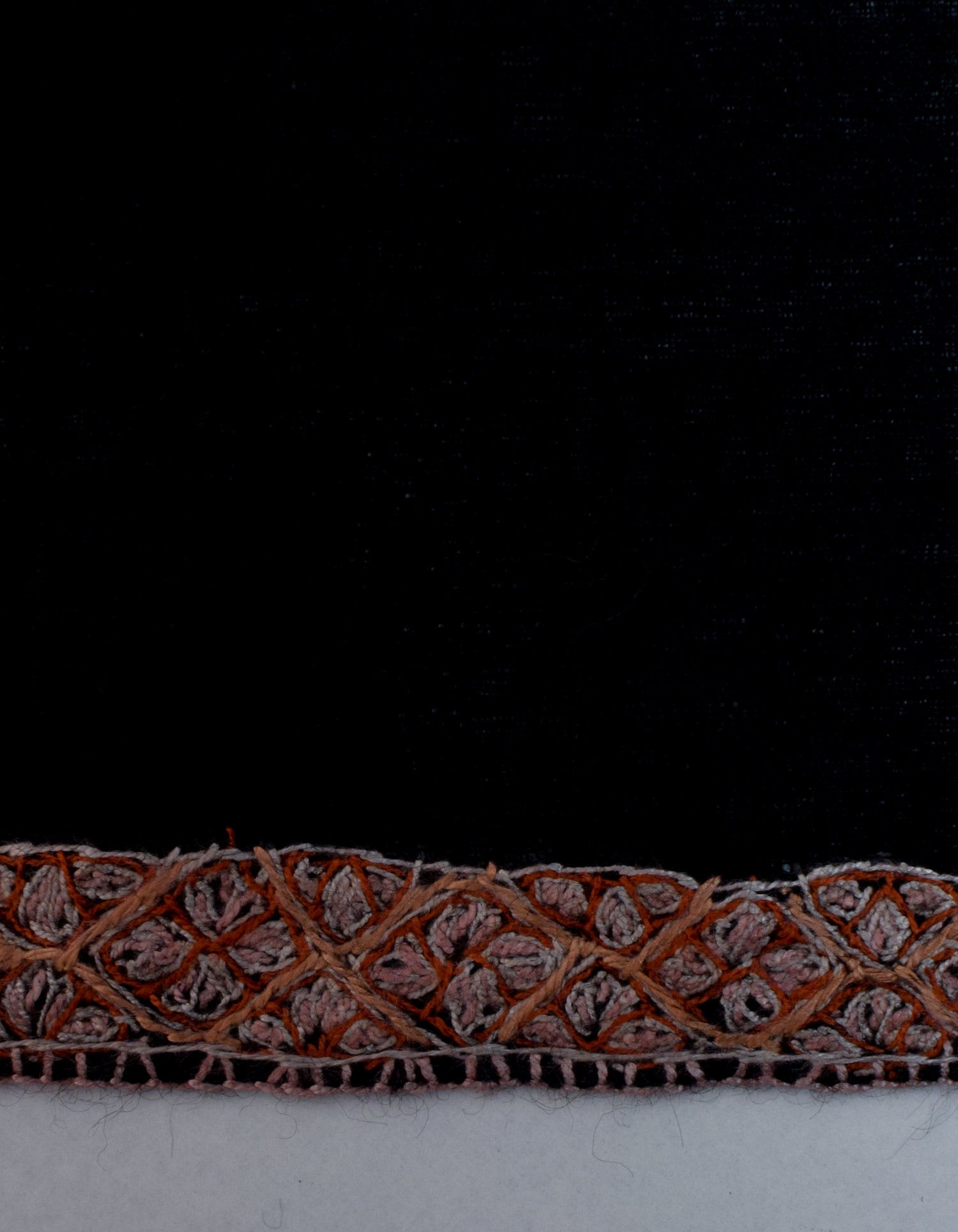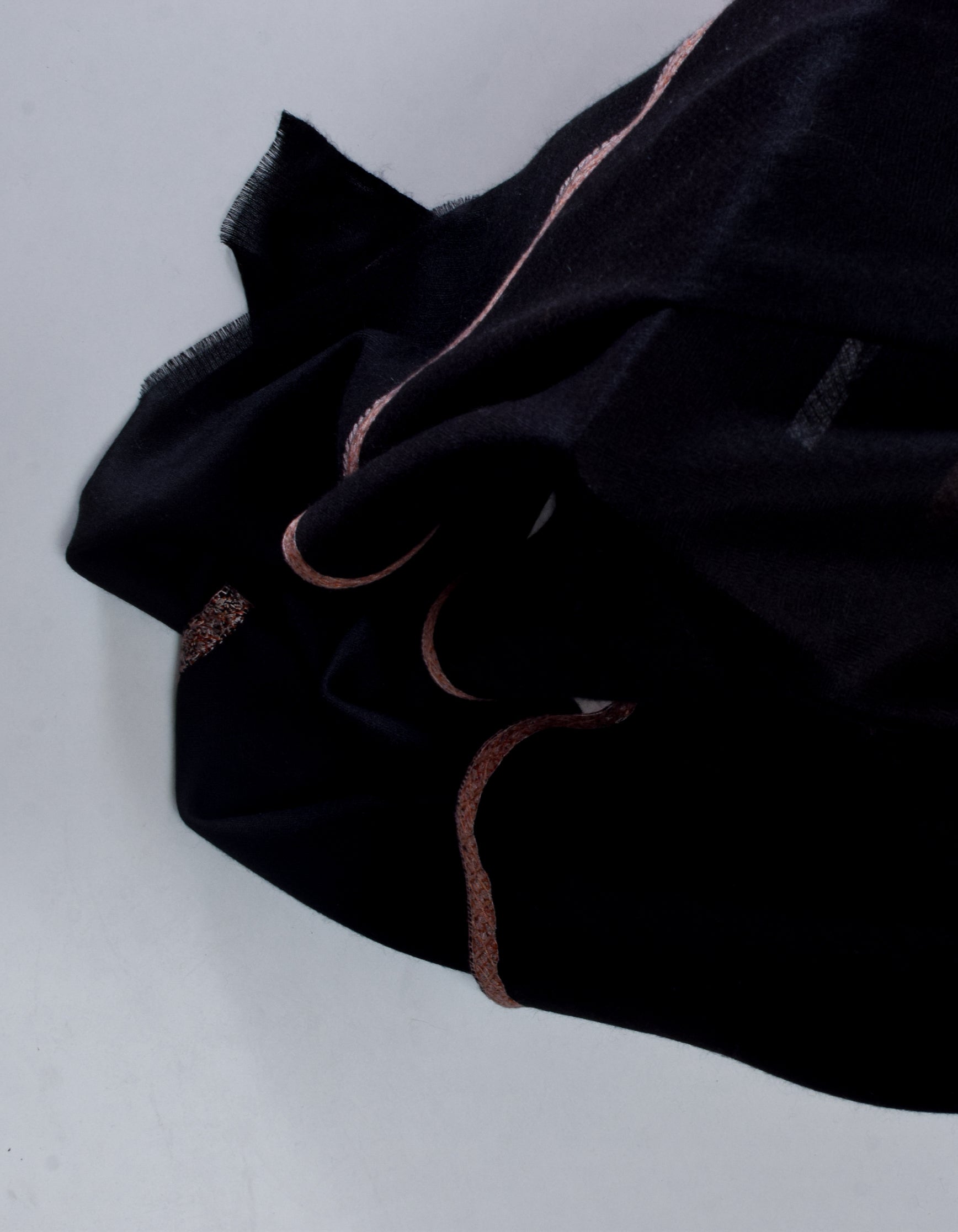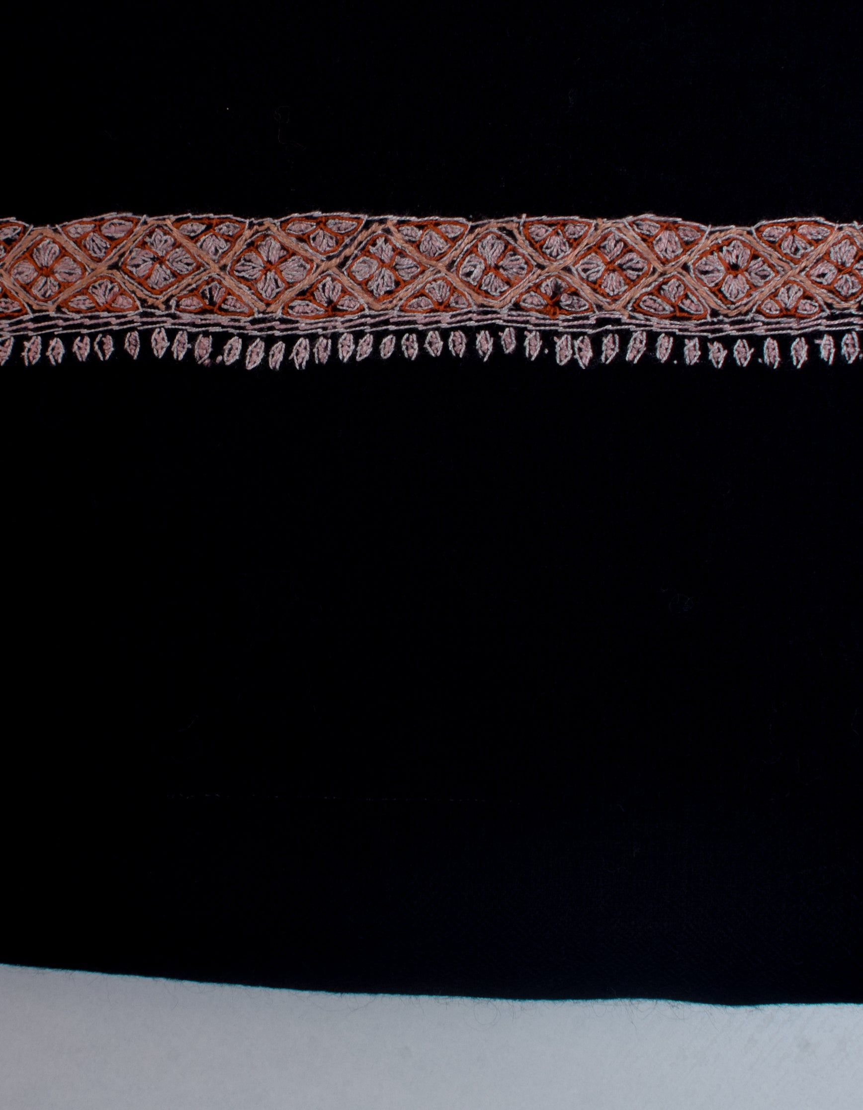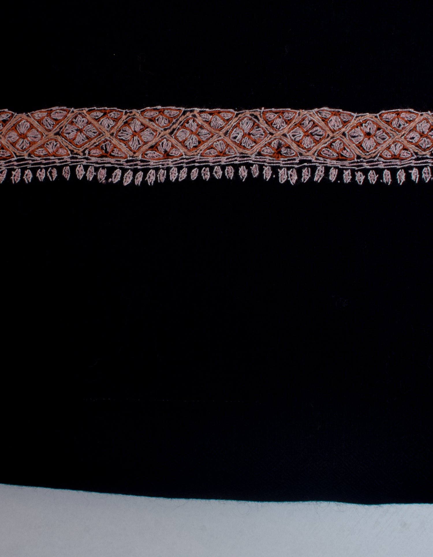 COLOUR: Black pashmina featuring sozni embroidery in burnt orange, peach, and light dusty pink.