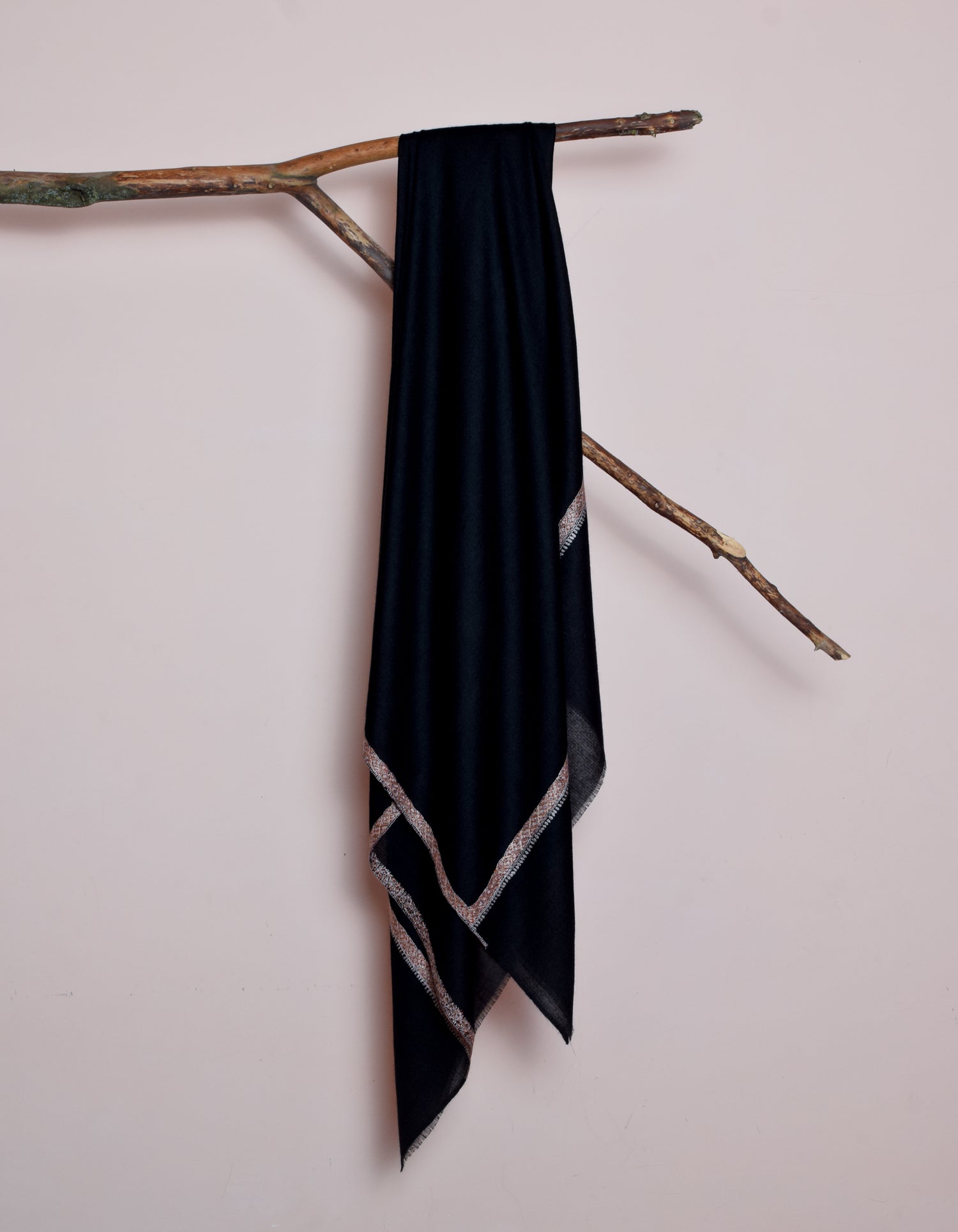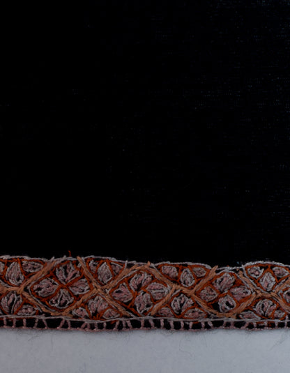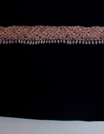 PRODUCT DESCRIPTION: Every time you wear this shawl, it shares a story of tradition and art. Made from the finest cashmere pashmina wool, this classic black pashmina is beautifully decorated with geometric floral embroidery along the edges in burnt orange, peach, and light dusty pink. Handwoven on traditional looms, this piece takes a lot of patience and skill to create. The artisans spend many hours crafting it, giving you luxury, warmth, and comfort. This pashmina shawl is not just a wrap; it shows the dedication of those who appreciate their craft.
