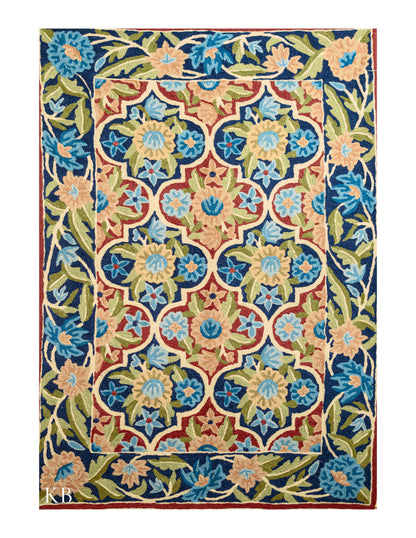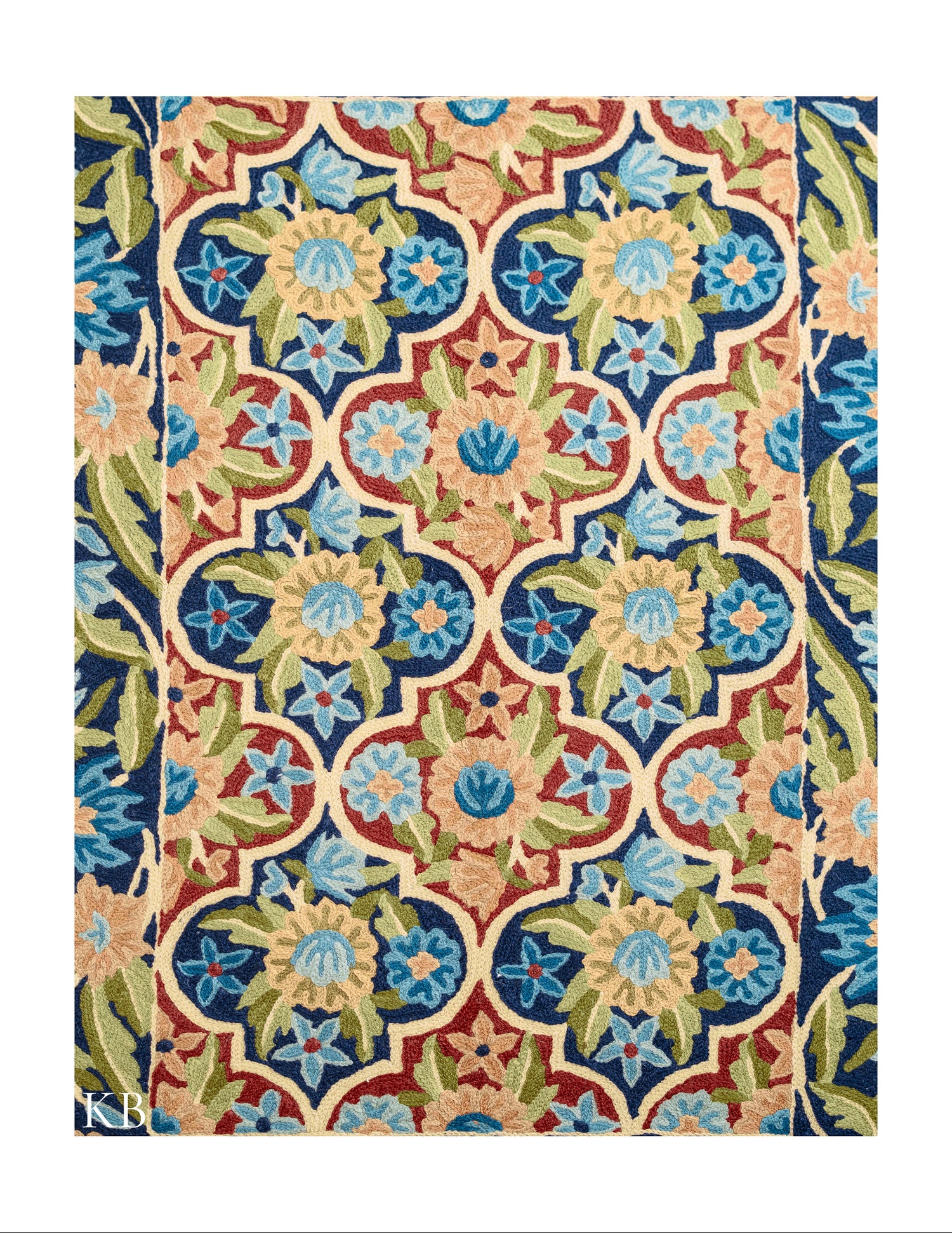 DESIGN DESCRIPTION: This Kashmiri handmade chain stitch wall hanging blends traditional craftsmanship with a modern touch. Inspired by Islamic, Central Asian, and Mughal art, it features a vibrant and intricate design. The central field showcases a repeating quatrefoil pattern with floral details, framed by a wide, ornate border. This piece harmonises contemporary style with deep cultural roots.