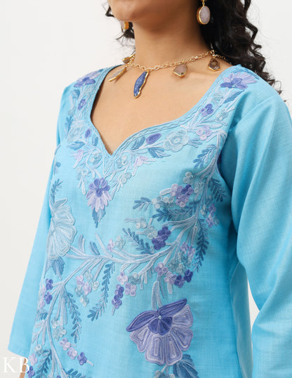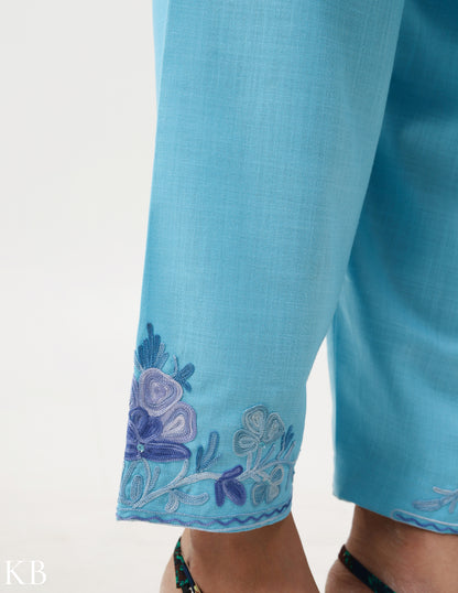 Fashion this season with our cool and comfortable Sky Blue Cotton Embroidered Two-Piece Summer Suit. It includes an aari-embroidered cotton shirt and bottom detailed with aari work around the ankle hem. The embroidery threads, in hues of blue, nicely complement the base color. Step out in style, radiating confidence and sophistication, and create lasting memories that will forever be associated with the warmth and beauty of the season.