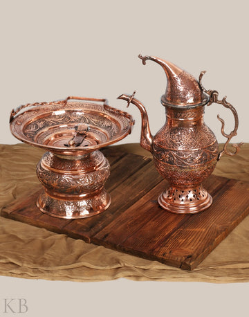 Traditionally used to wash hands before and after meals, the Tasht e Naari comprises of a large flask in which water is stored and a basin which contains that water once the hand washing is done. The Tasht e Naari is ornated with beautiful engravings of Chinars and their entangled vines. Bring home the tradition of using a Tasht e Naari and add an element of art to your decor and daily use.
