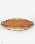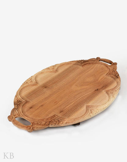 Serving is exemplified with an explicit wooden tray which has been carved in the luxury of walnut wood. The tray is beautified in elaborate carvings which are hand crafted by the finest of Kashmiri craftsmen with utmost skill and dedication. The classic serve ware is mounted on a stand and displays a curvy frame surrounded by vineal carvings. Two clasps make the utility easy to carry and resplendent to look at. Bring home the woody charm of this piece of serving cum decor and let it make a statement of exclusivity and class within your abode.
